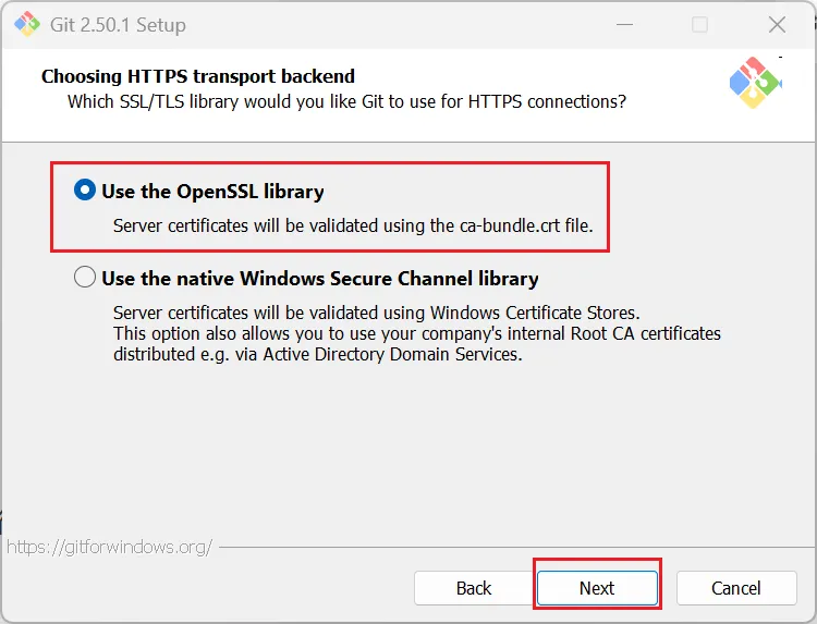 第二个是“从命令行以及第三方软件进行Git”。默认这个配置也是被推荐的,被认为是安全的,因为它仅向PATH添加了一些最小的Git包装器,以避免使用可选的Unix工具造成环境混乱。能够从Git Bash,命令提示符和Windows PowerShell以及在PATH中寻找Git的任何第三方软件中使用Git。