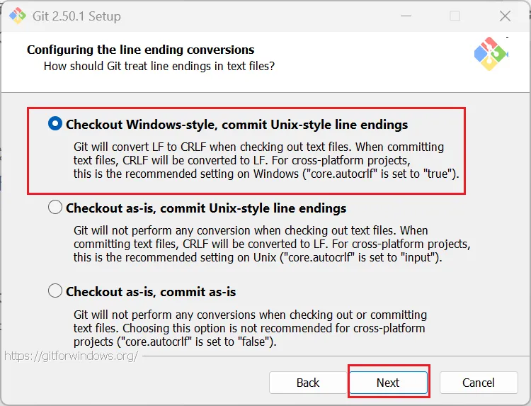 选择默认选项Checkout Windows-style, commit Unix-style line endings即可。