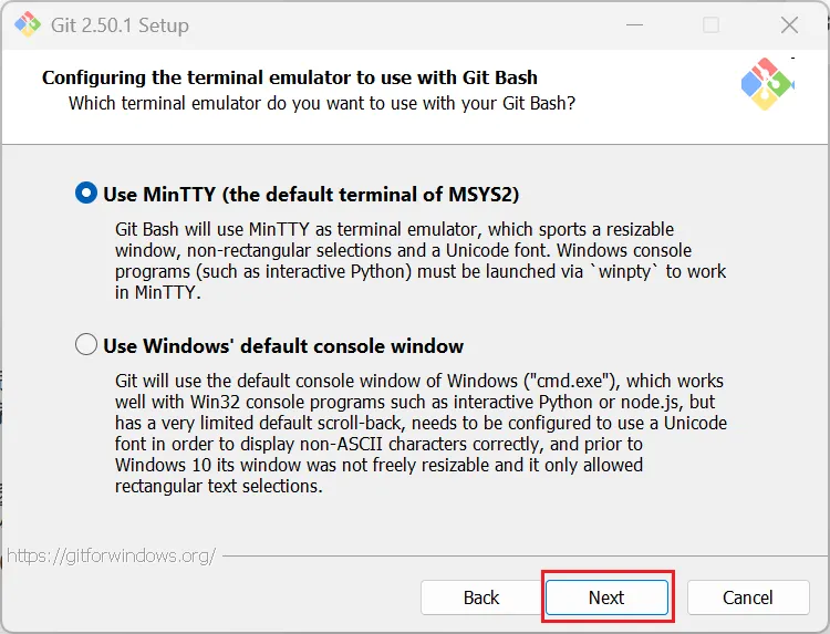 第一个是“使用MinTTY(MSYS2的默认终端)”。Git Bash将使用MinTTY作为终端模拟器,该模拟器具有可调整大小的窗口,非矩形选择和Unicode字体。Windows控制台程序(例如交互Python)必须通过“ winpty”启动才能在MinTTY中运行。