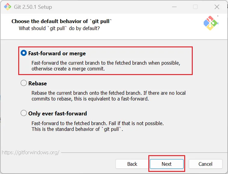 第一个是默认值,这是“git pu”的标准行为:尽可能将当前分支快速转发到获取的分支,否则创建合并提交