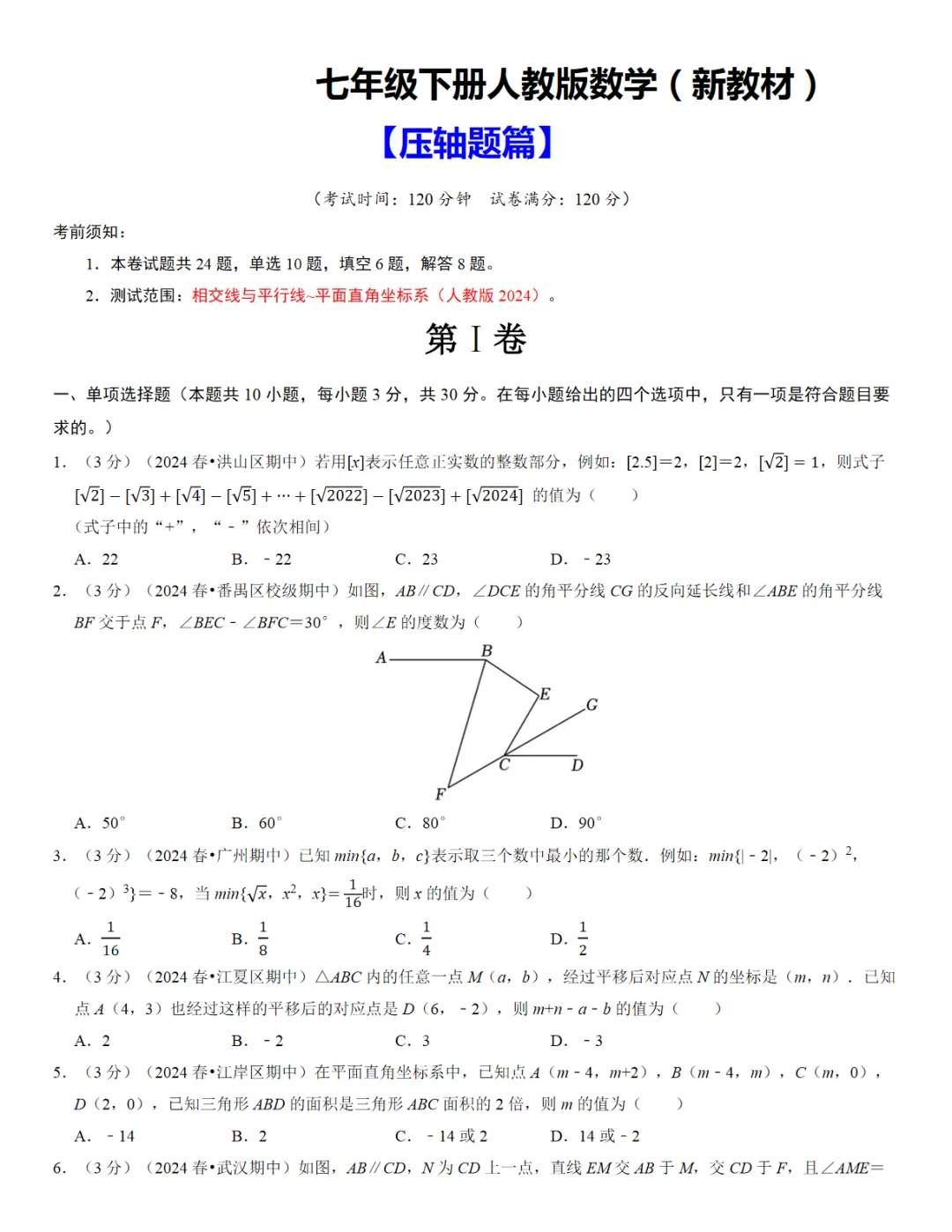 七下人教数学期中压轴题专项卷(人教版2024)(考试版)【测试范围:相交线与平行线~平面直角坐标系】https://pan.baidu.com/s/1sY6UNsU6-vRwC4kenwxA5Q?pwd=8888复制网盘链接,微信发送给自己(文件传输助手,或者别人)可以直接打开链接,或者复制到浏览器打开,及时保存资源,以免资源失效!(温馨提示:全套教辅资源点击文末“阅读原文”可领取)①:点一点右下角的“赞”和“在看”,感谢