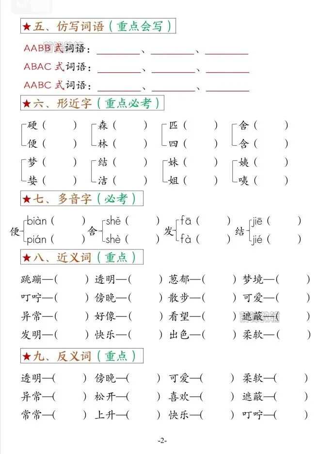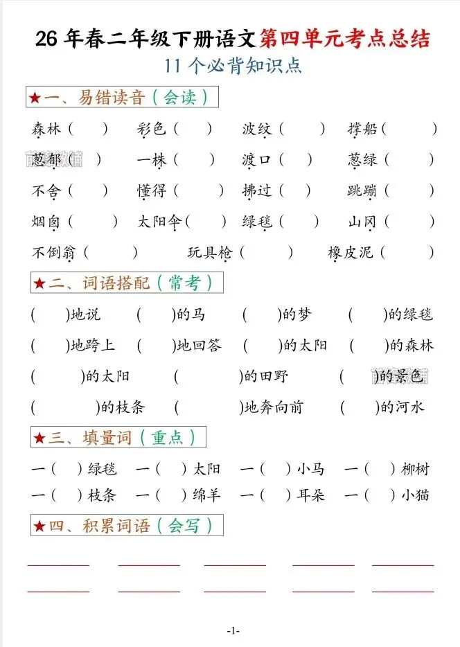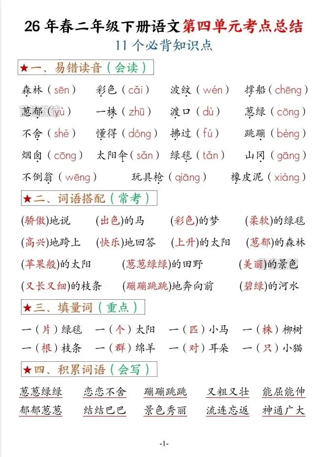 今天给大家整理了26春二年级下册语文第四单元考点总结+空白版,转发给朋友或班级群,受益更多人,帮助孩子学习!