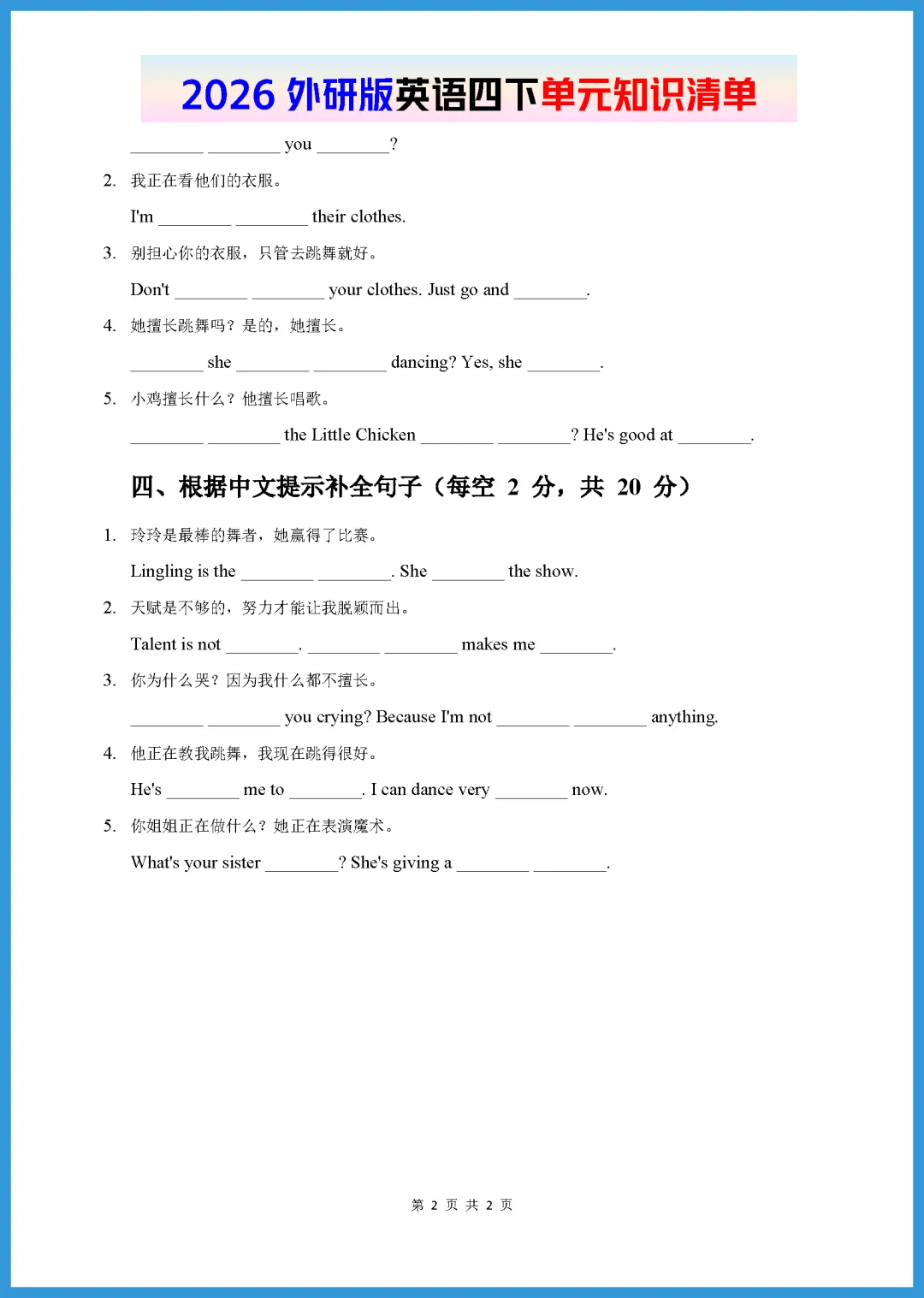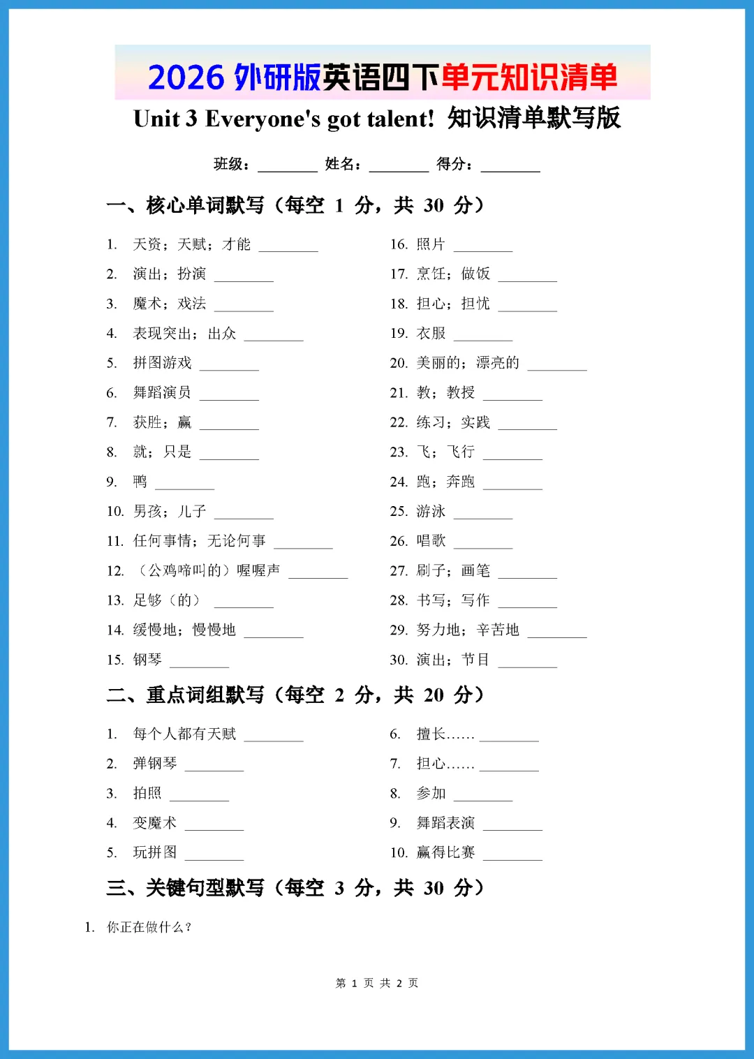 各位家长好!今天分享一份 2026 年春季外研版英语知识清单,专为孩子们打造的 Unit 3 默写版,共 2 页精华内容。这份资料涵盖了单元核心词汇、重点短语及关键句型,采用留空默写形式,能帮助孩子快速自查漏洞,巩固基础记忆,轻松应对校内测验。篇幅短小精悍,孩子利用碎片时间就能高效完成。需要的家长抓紧打印给孩子练一练吧,扎实基础就从今天的默写开始!