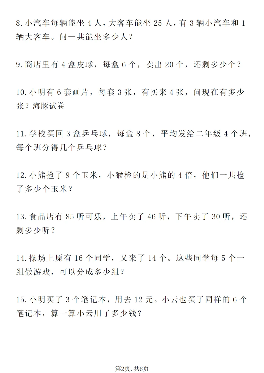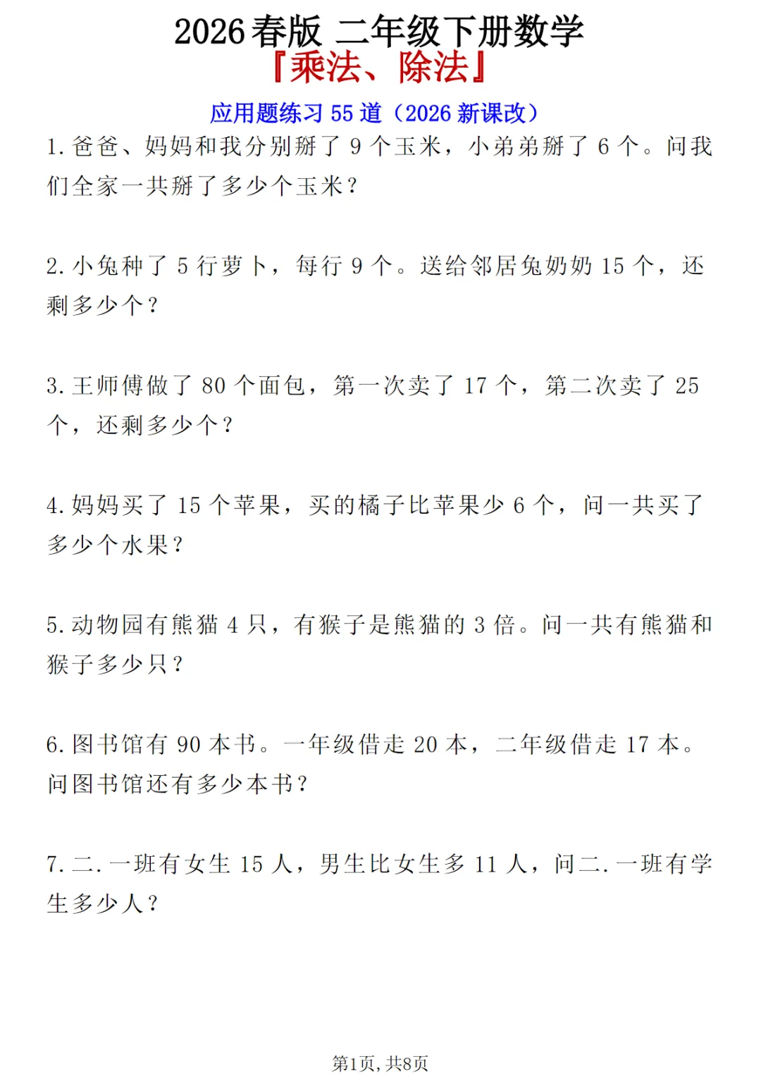 【免费下载】2026春新版二年级(下)数学 『乘法、除法』应用题练习55道.,PDF电子版,共8页,先保存,以免资源失效