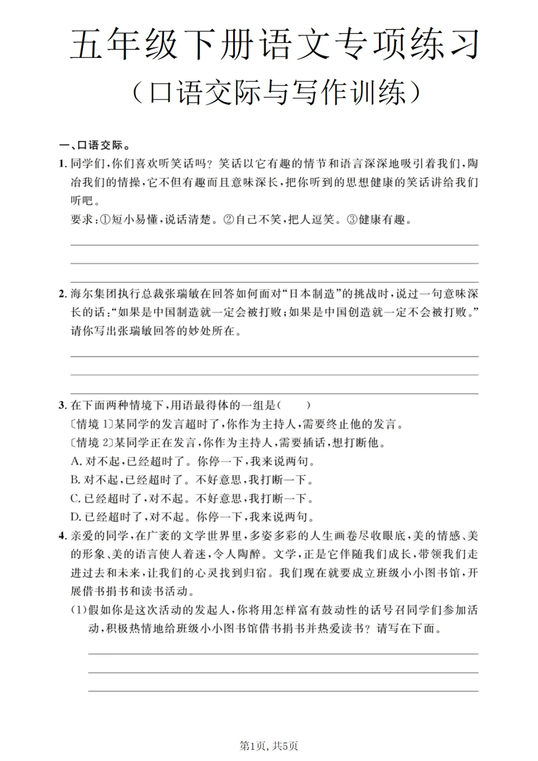 五年级(下)语文 口语交际与写作训练专项练习
