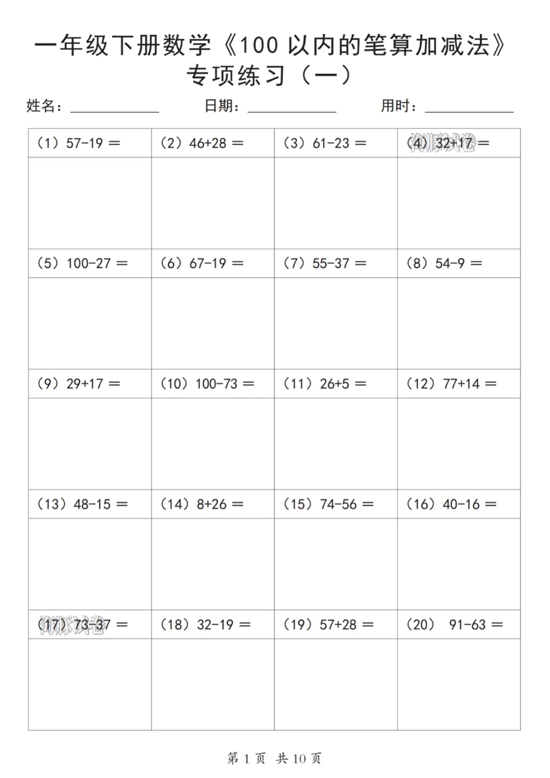【免费下载】【海豚试卷】26春一年级(下)数学《100以内的笔算加减法》专项练习(1),PDF电子版,共10页,先保存,以免资源失效