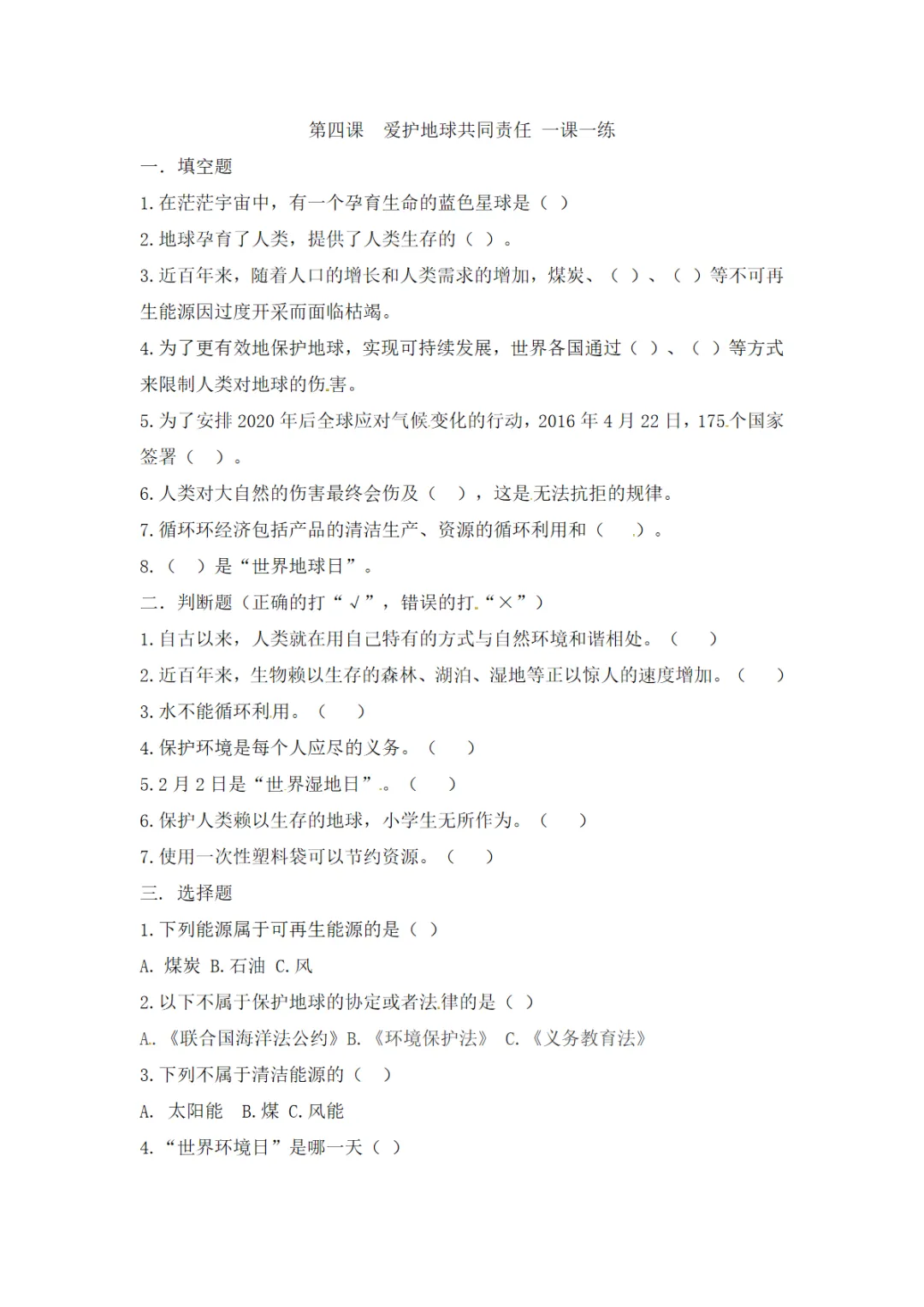【免费下载】六年级(下)道法 第四课 爱护地球共同责任 (同步练),PDF电子版,共3页,先保存,以免资源失效