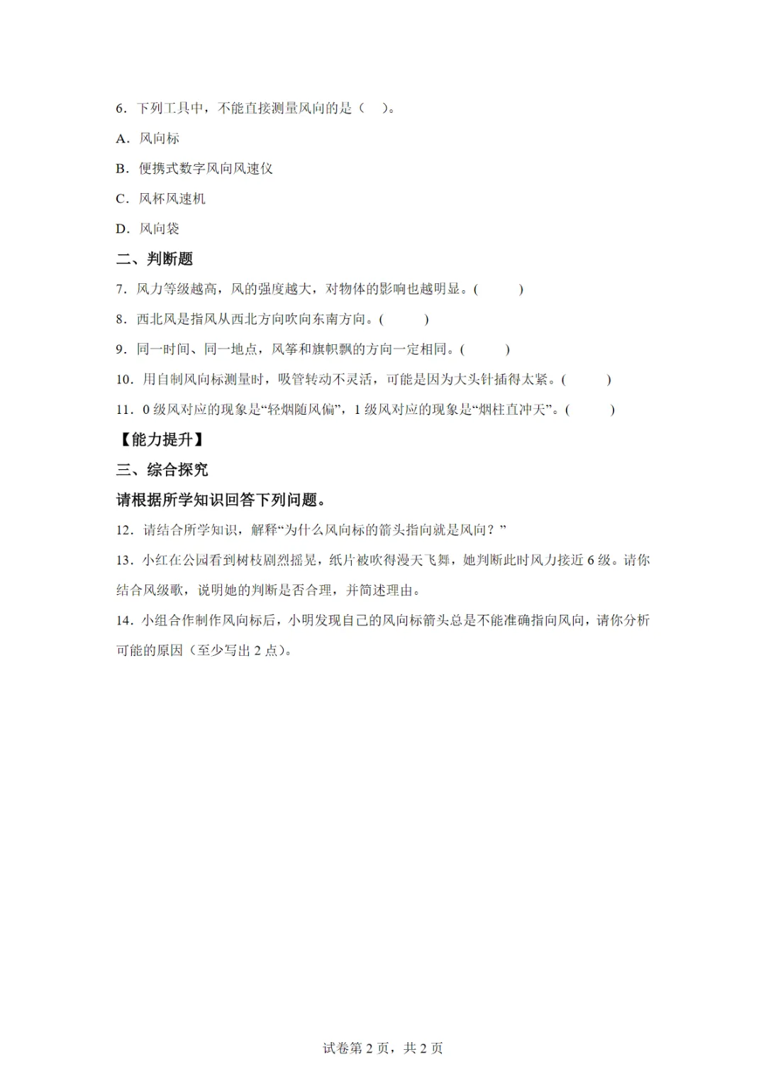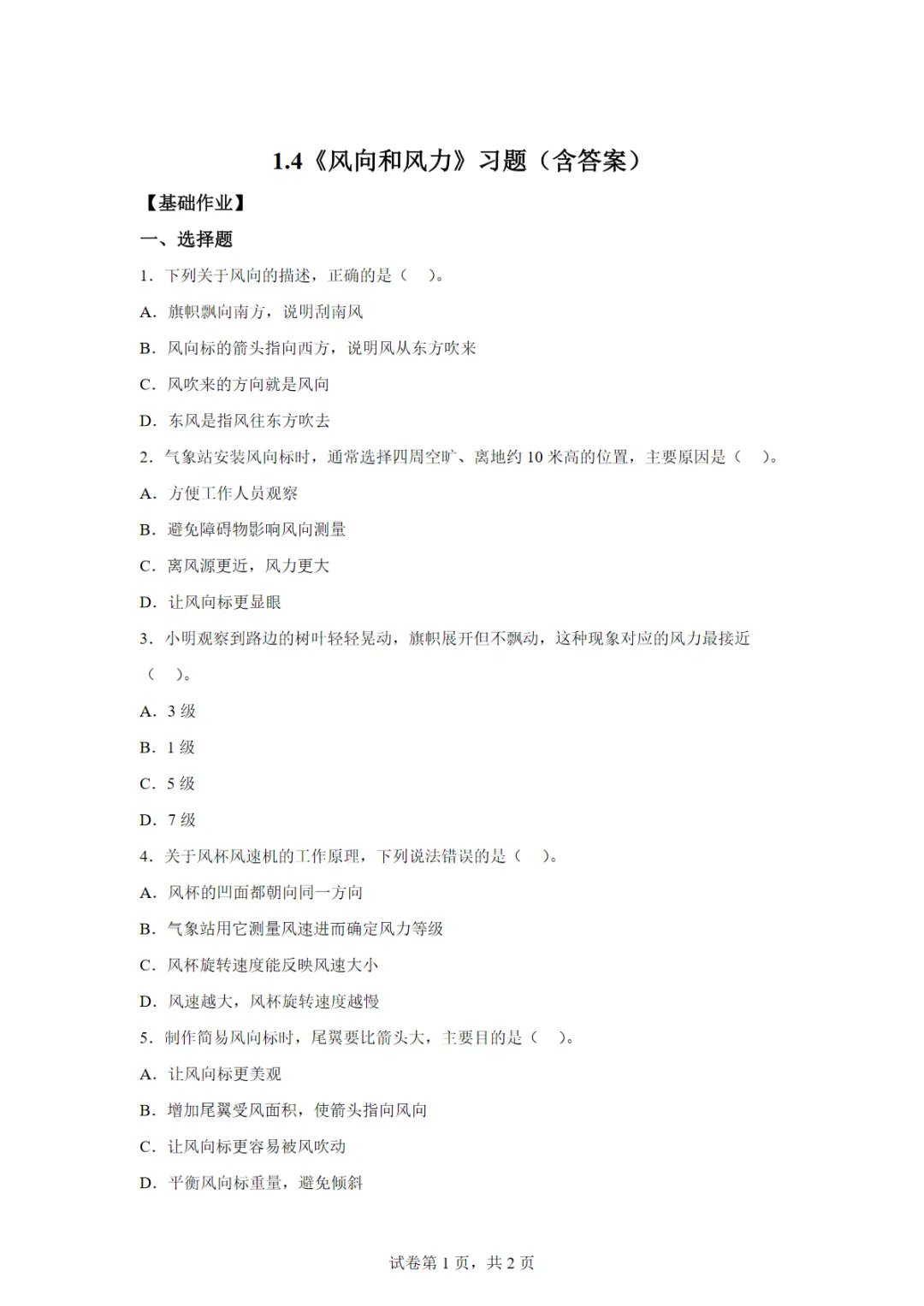 【免费下载】三年级(下)科学 1.4 风向和风力(分层作业)《青岛54版》,PDF电子版,共5页,先保存,以免资源失效