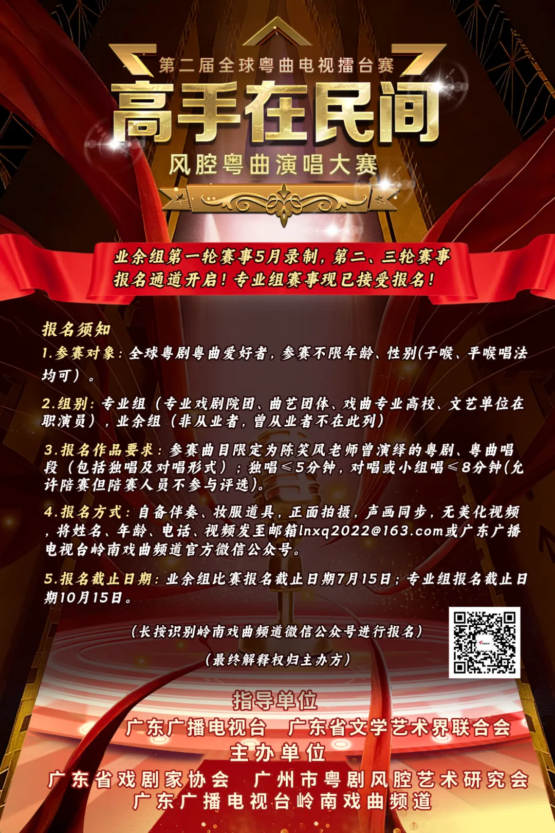 激活民间传承基因,筑牢岭南文化根基!第二届全球粤曲电视擂台赛《高手在民间》之“风腔”粤曲演唱大赛第二轮报名火热进行中,等你来啦!