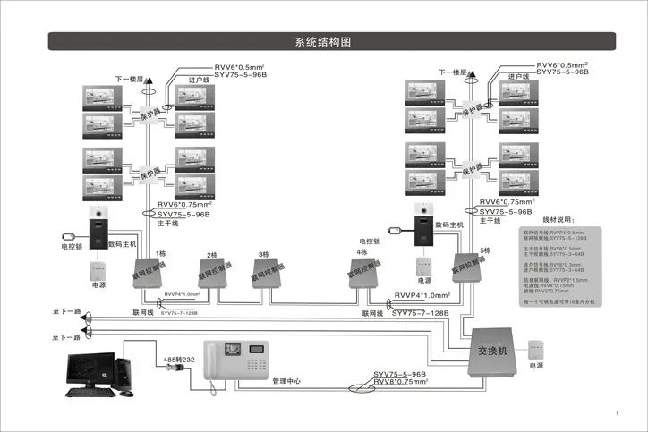 本小区的楼宇门禁对讲系统原采用黑白模拟系统,在运行多年以后,受各种原因影响,需要全面更新改造。 1、产品自然老化,需要更新改造。小区门禁对讲系统已使用8年以上,电子原器件自然老化,故障不断,需要更新改造;2、厂家设备停产,需要全面更换改造。小区的产品在使用8年以上后,原厂家产品升级换代,产品停产,无法维修;3、厂家消失,无法维修。小区的开发商选择价格低、质量低劣的产品,找不到生产厂家,无法维修;4、部分小区的前期物业公司技术力量弱,又不愿支付维保费用聘请专业的维保公司,导致系统彻底瘫痪。小区门禁对讲系统的瘫痪,直接威胁到小区的安全,使得乱贴小广告、上门推销、上门诈骗等时有发生,不仅严重干扰了小区业主的生活,降低了小区的档次,而且阻止了小区房产物业的升值,使得业主蒙受巨大损失。因此,恢复小区门禁对讲系统成为小区业主委员会和新聘任物业公司的一项重要工作。然而,在恢复门禁对讲系统时却面临许多障碍。一个完善的智能化社区,具有便捷、安全、舒适、高档的生活环境,确保每一个住户的生命财产的安全,是本系统最大的意义,创造一个住宅的理想空间是本系统的目的所在。 小区楼宇对讲联网系统、是根据我国实行封闭式管理住宅小区的特点专门设计的产品。它针对分布式住宅小区的管理特点进行功能规划,如多通道内部通讯、双向呼叫对讲、住户报警、防盗防灾报警等等,把单纯访客开门提升到多功能综合管理层面上,对提高小区安全管理、方便住户起到积极的作用该系统由管理中心的管理主机、单元门上的单元门口主机、住户家中的室内分机以及系统电源及一系列的信号类产品所组成。本系统是一种总线制全数字双向对讲报警及信息发布系统。总线制全数字双向对讲报警系统是采用数字编码技术和双向通讯传输技术,即室内分机能向管理中心报警,并与管理中心、楼栋主机实现双向呼叫。由于是全数字双向系统,具有较强的系统功能,如住户可在室内机上报警或外接报警按钮,住户呼叫管理中心,通话限时,开门权限控制等。这种系统适合小区内部对讲系统,同时可扩充实现家庭防盗报警联网系统,通过管理中心管理平台可向住户指定或群发各种信息。因此该系统具有较高的性能价格比。 ☆本可视对讲系统具有双重验证来访者身份,可视监察来访者影像及住户紧急报警管理功能。☆所有的围墙门主机、门口主机(单元门口机),联网控制,最后由中心的管理员机统一管理。☆进入小区的来访者,在住宅楼单元门的可视主机上按下欲访问的住户对应的楼层号和房号,住户家的可视分机“叮咚”振铃提示有客来访,分机的荧光屏即刻自动显示来访者的影像。☆住户可根据来访者的影像,确认是否与来访者通话和放行。☆住户按下开锁键,可遥控打开住宅大堂的电控锁(为防止大堂大门被随意打开,仅限于通话过程中可遥控打开电控锁),让来访者进入大楼。☆不使用时候(即没有住户和来访者在通话对讲),住户可按下分机上的监视键,荧光屏将自动显示门口的情况,供住户对门口情况进行监视。☆任何时候(24小时),住户可按下分机上的紧急呼叫按钮,呼叫管理员机,管理员机即刻鸣响报警,并显示、存储报警记录。☆管理员机可直接呼叫任意一户住户,并与住户双向通话对讲。☆可通过门口主机的管理机按钮,呼叫管理员机,并通话对讲。☆管理员机可遥控打开各栋住宅楼的电控锁(在与门口主机通话有效)。2、 小区门口机和单元主机:ID刷卡 密码开锁 门禁触摸主机,ARS高清镜头3、 中心管理机:接收小区住户的呼叫、求救、火警、报警等信号,呼叫小区内住户,LCD液晶显示,显示呼叫分机、门口机的地址码.,显示报警求救、火警、周界报警等信号,与门口机、围墙机、室内分机对讲及单元门开锁.。系统可采用标准总线结构传输数据,不同类型的分机和不同楼栋的主机都可以通过总线互联组网。从而使系统具有组网灵活,便于扩充,能满足用户的各种需求。通过系统的设计将每一期设置为一个区域,小区规划各区的通讯以及整个小区的联网将在一条高速的总线上运行 系统具有方便灵活的白天或夜间管理模式,管理员能够通过管理机对任何一栋楼的门口进行管理,即对各门口来访者的呼叫进行干预。干预时这栋楼的来访者对楼内用户的呼叫,自动转到管理机。经管理员许可后由管理员转接,才能使来访者与用户通话,这种管理模式确保小区的严格管理,满足不同层次物业管理者的要求。系统分机可具有家庭安防功能,分机的 采用两种方式,一种是互通对讲分机自身具有四路防区的报警功能;一种是可视对讲分机带有的八防区报警系统。它们都具有延时防区和24小时紧急防区,可外接门磁、红外、烟感、煤气、紧急按钮等报警探头。不但可以向管理机报警,也可以向管理中心的电脑报警。管理机或管理中心的电脑能记录报警地点、房号、防区等。管理中心的电脑还会自动弹出报警点的电子地图。整个系统每一幢楼、管理中心单独供电,万一出现电源故障,不会影响整个系统的运行。遇到市电断电,自动启动后备电源。在系统设计的时候,我们要有目的的把社区按现场分为若干个小片区,通过信号类产品汇总到管理中心,单元内部则可通过层间信号类产品,使得系统有线路短路保护,一旦线路短路,不至于影响整个系