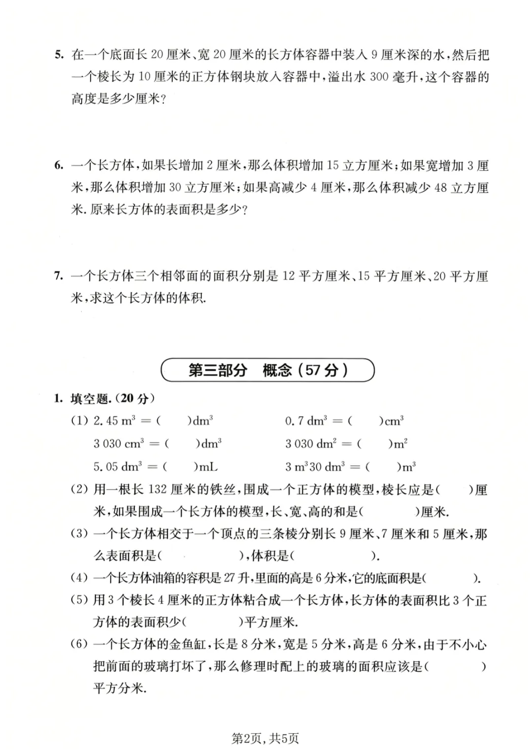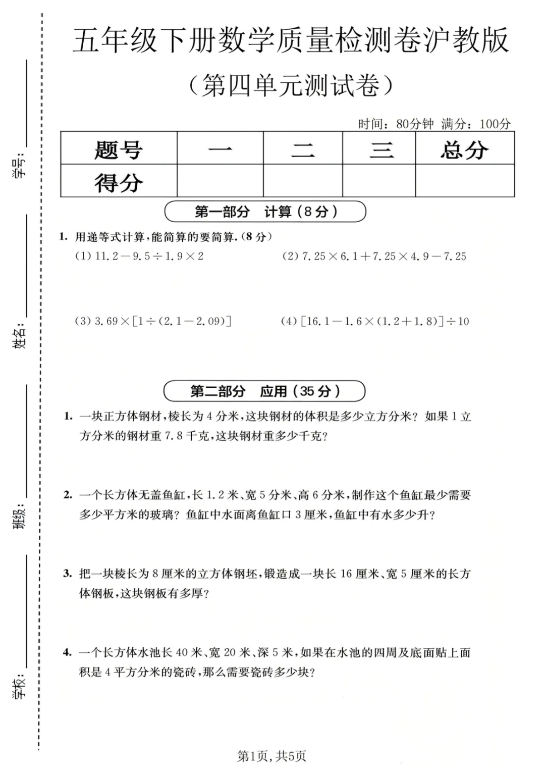 【免费下载】五年级(下)数学 第四单元质量检测卷《沪教版》,PDF电子版,共5页,先保存,以免资源失效
