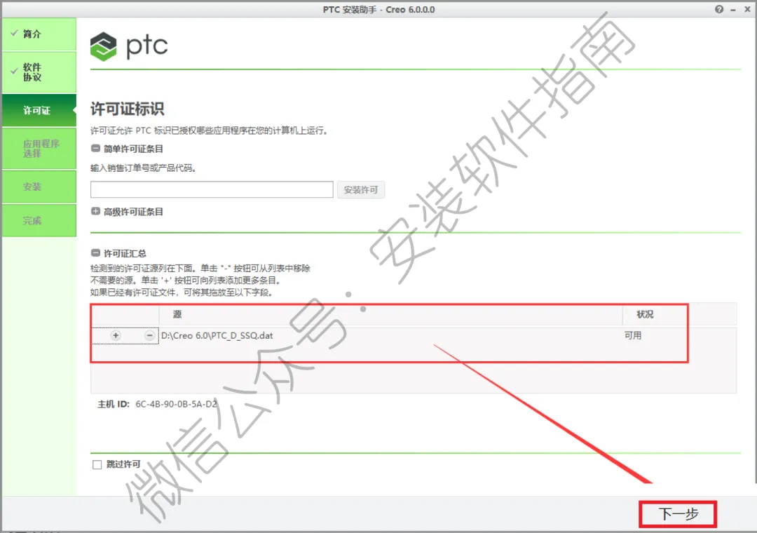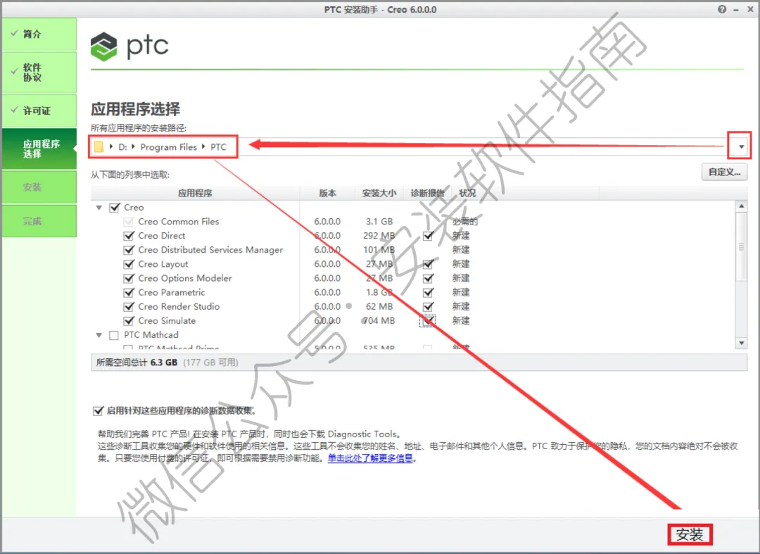 23.点击应用程序选择的最右侧《三角图标》更改软件安装路径:建议安装到除C盘以外的磁盘,在D盘《ProgramFiles》文件夹下新建一个《PTC》文件夹(或者可以直接把左边框内“C”盘更改成“D”即可)然后点击《安装》。