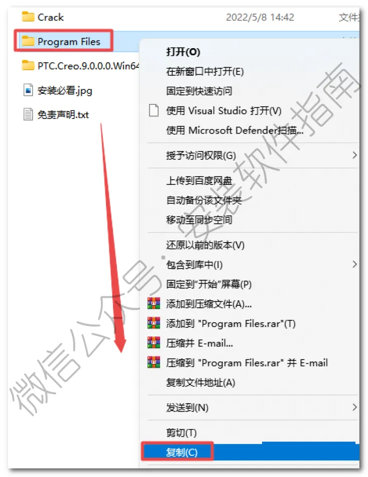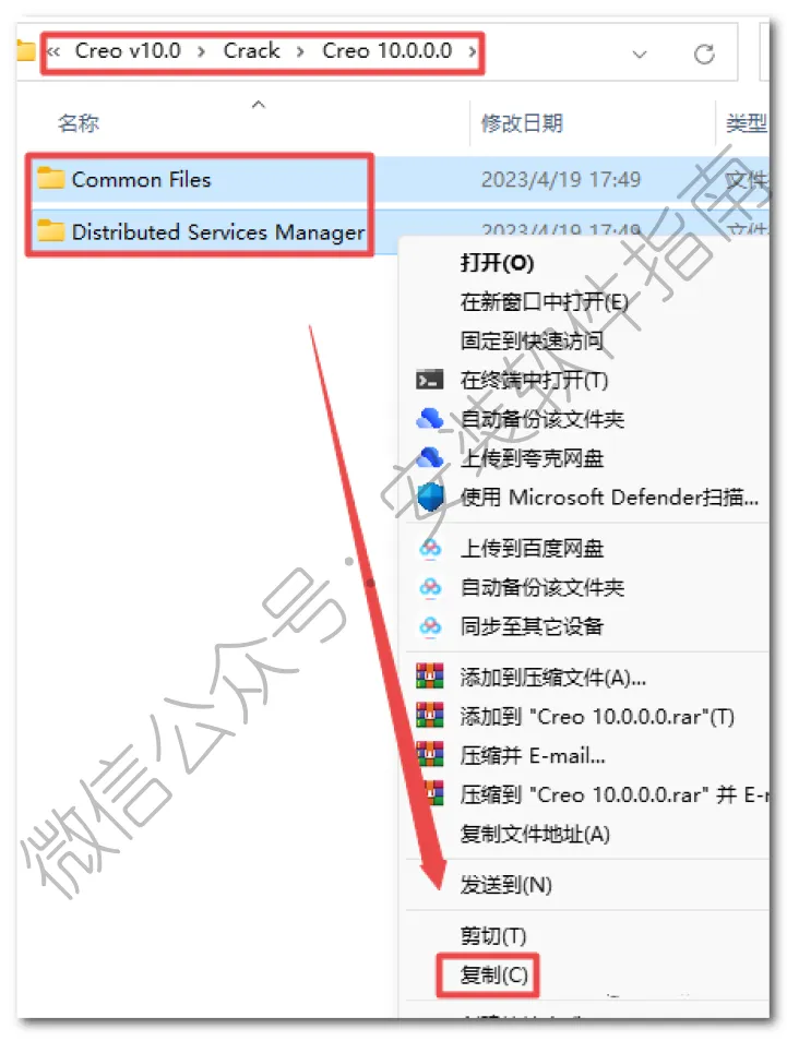 21.返回之前解压出来的”文件夹,依次打开“Crack——Creo 10.0.0.0”文件夹,选中该文件夹下的全部文件,鼠标右键选择“复制”