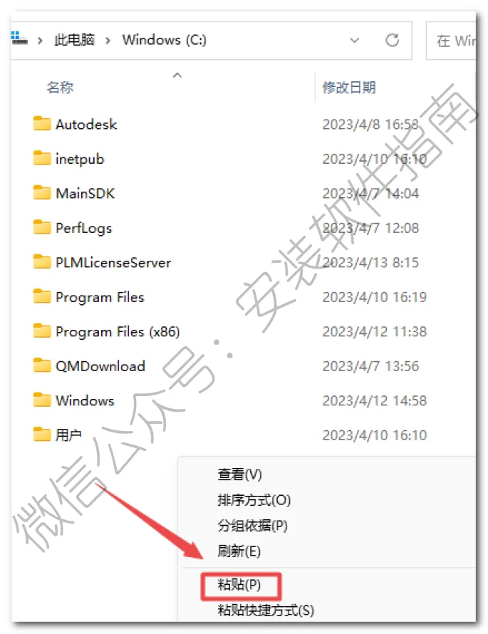 3、打开桌面“此电脑”(Win7的计算机),打开C盘根目录,鼠标右键“粘贴”复制的文件夹