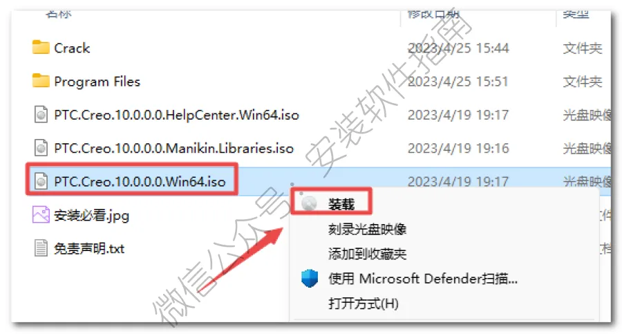 12.返回之前解压的“Creo v10.0”文件夹,选中“如下图文件,鼠标右键选择“装载”(如果没有“装载”选项的可以右键选择“打开方式—Windows资源管理器”打开,Win7系统直接右键解压)