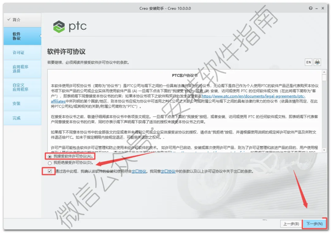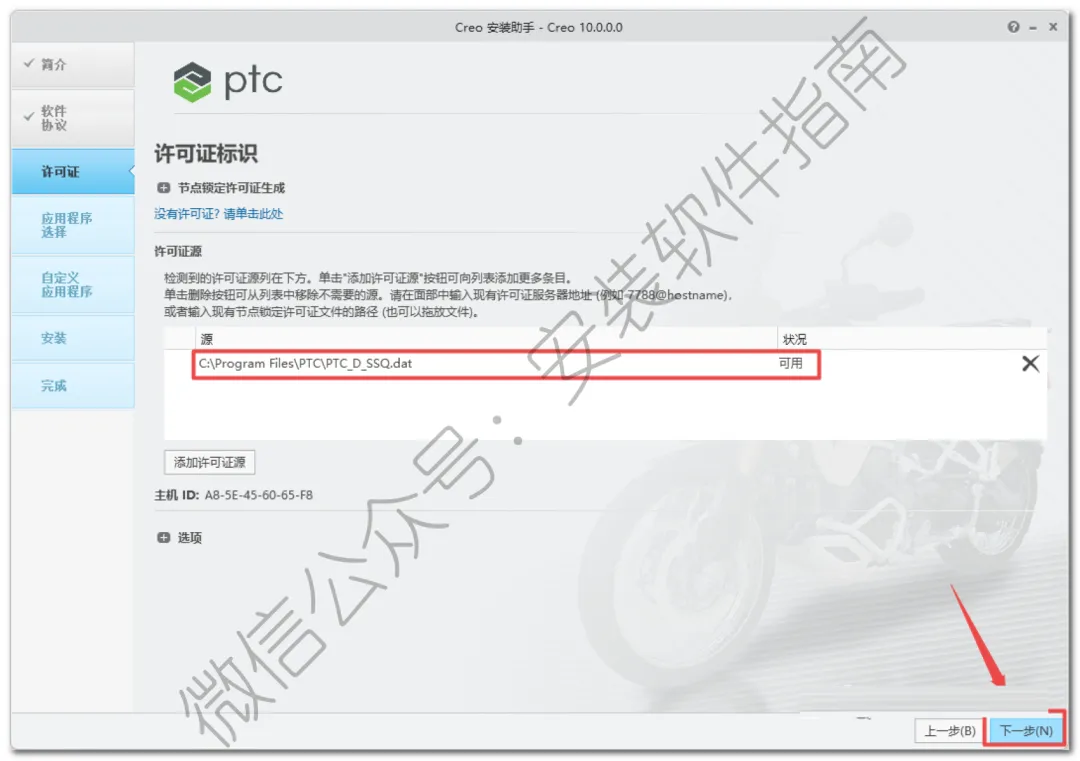 16.软件会自动识别许可证(如果没有识别,将之前(第6步)生成的“PTC_D_SSQ.dat”文件拖动到许可证位置),状况处显示”可用“,说明没有任何问题,直接点击”下一步”温馨提示:”PTC_D_SSQ.dat”文件路径为【C:\Program Files\PTC】