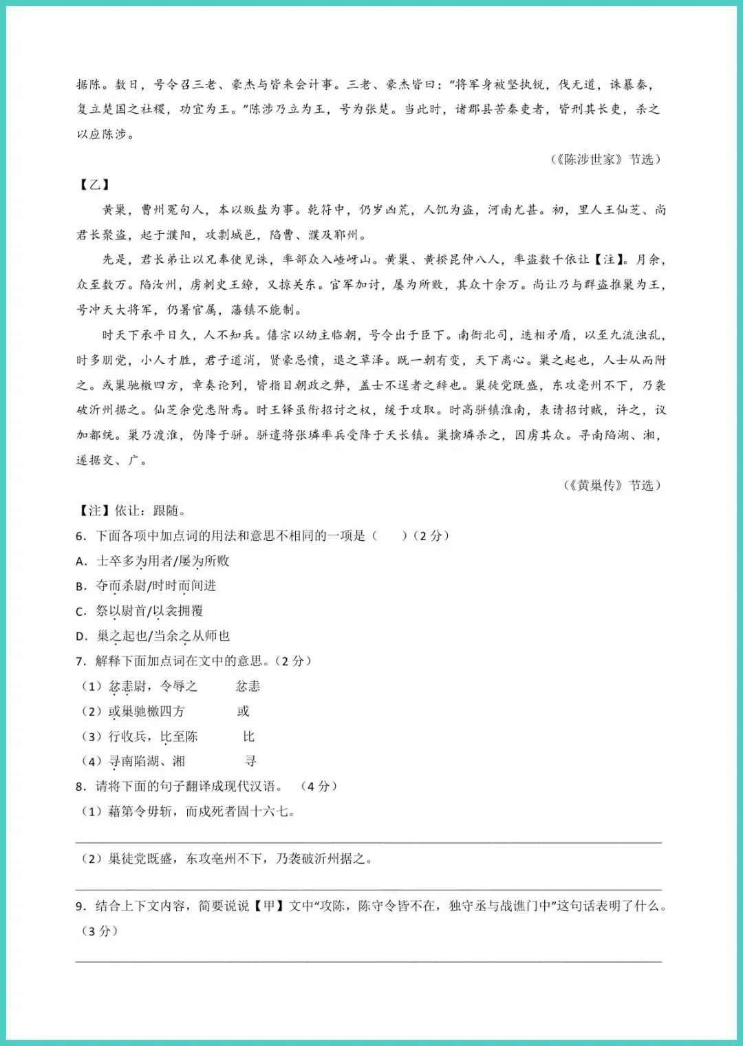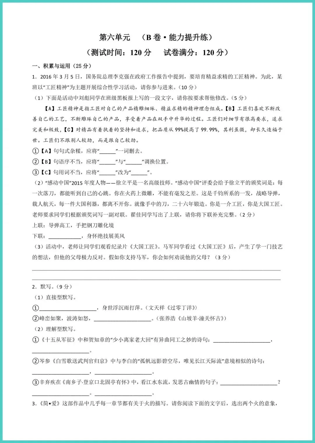 26春人教版九年级下册语文第6单元B卷能力提升版,16页电子版,一线名师精编,紧扣中考风向。含古诗文对比阅读、现代文高阶题型、写作立意升级训练,附答案详解与得分模板,帮孩子突破“读懂却不会答”的瓶颈,一周练透,阅读作文双提10分!初三冲刺分秒必争,需要的家长现在就打印,让孩子今晚多练一页,考场多拿一分!