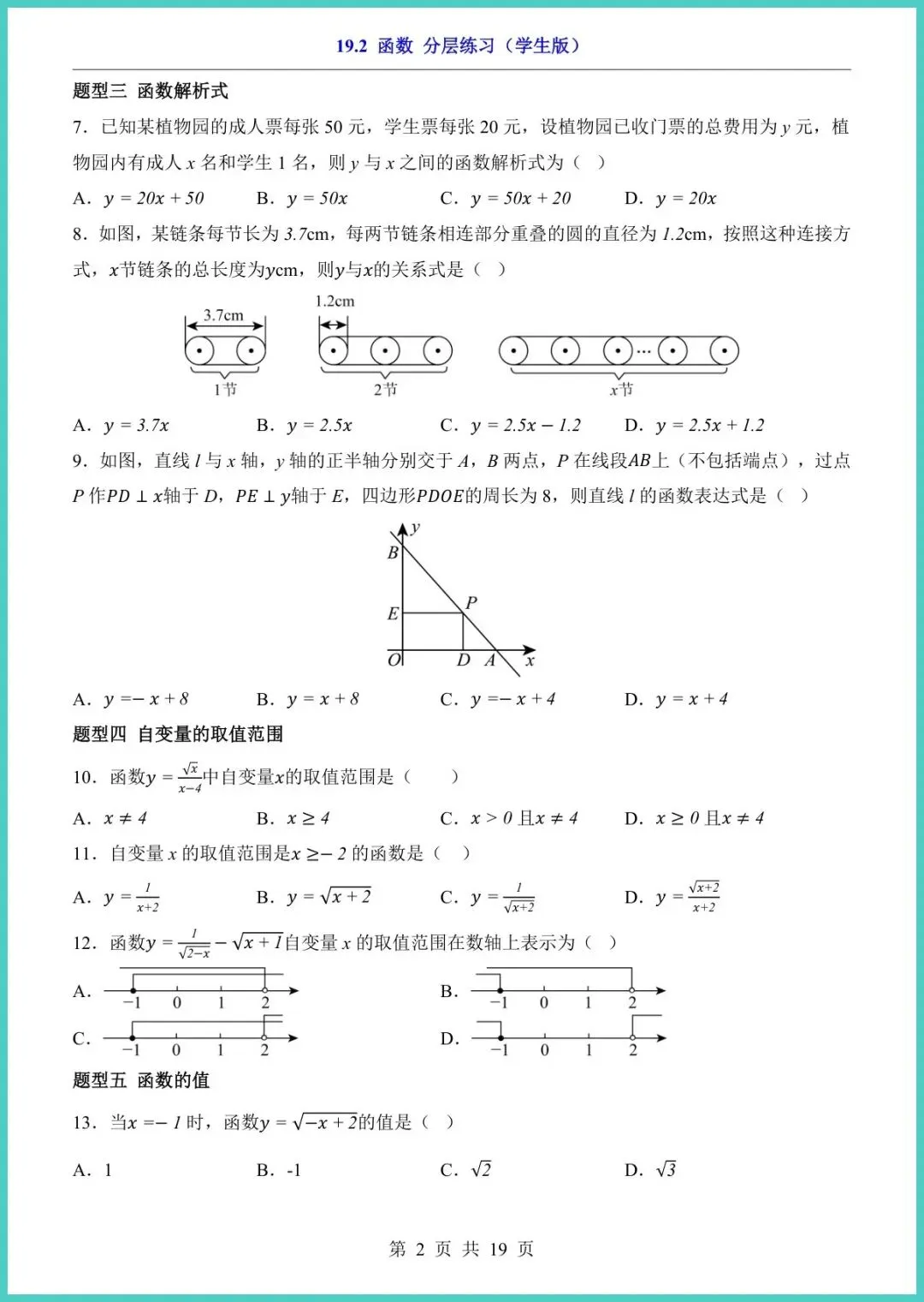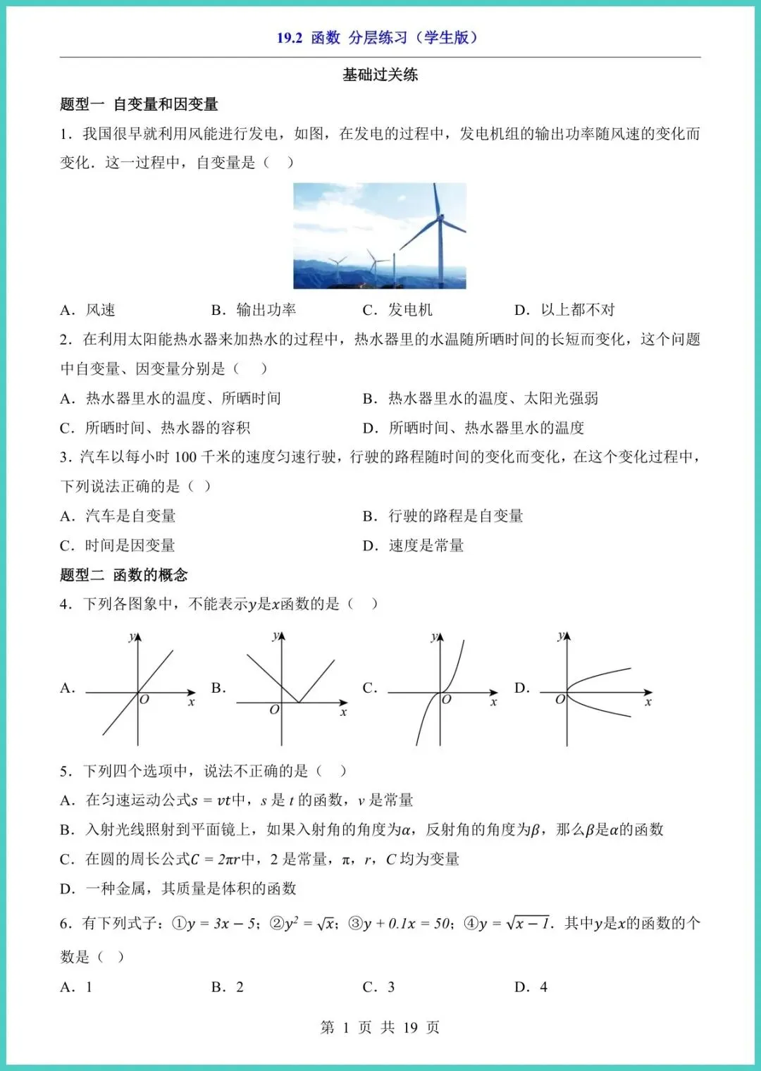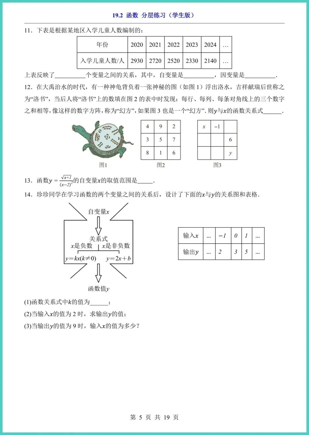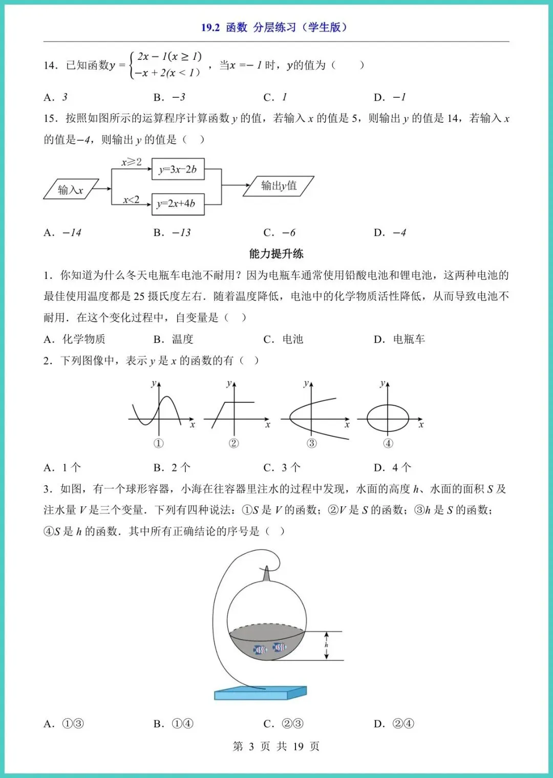 26年春冀教版八年级下册数学《19.2 函数》分层练习,共19页,电子版一键下载打印!这份小册子把函数拆成“基础巩固—能力提升—拓展冲刺”三层,每道题都配思路点拨,让孩子先稳根基再冲高分;易错题、变式题、中考真题层层递进,轻松攻克坐标、解析式、应用题难点。每天15分钟,函数不再“云里雾里”,成绩蹭蹭往上涨!想让孩子开学就领跑的家长,赶紧打印出来练一练吧!