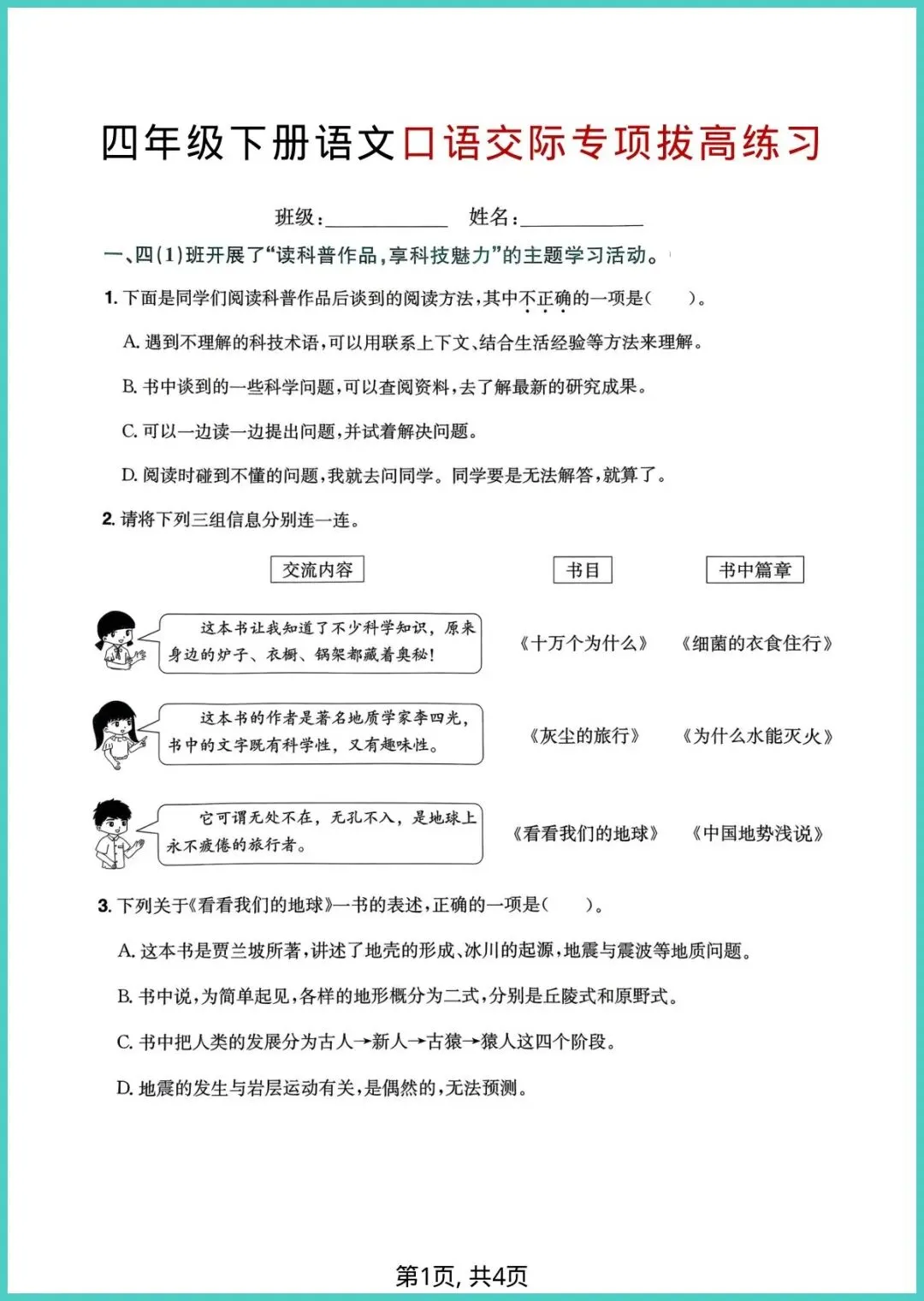 【免费下载】四年级(下)语文_口语交际专项拔高练习 | PDF完整高清电子版可打印