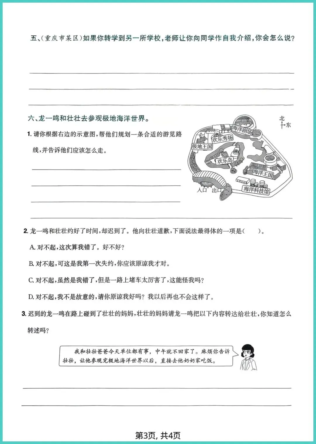 24春人教版四年级下册语文《口语交际专项拔高练习》,新鲜出炉4页电子版,手机就能直接打印!这份小册子把课本里的“学会安慰、转述通知、小组讨论、情景应对”四大高频考点拆成12道阶梯题:有思维导图帮孩子搭话架子,有示范音频二维码跟读正音,还有“金句储蓄罐”秒变高分词库。每天10分钟,孩子敢开口、逻辑清、表达亮,连班主任都夸“像换了个人”!想让孩子从“默默听”到“侃侃谈”的家长,现在就打印,今晚就能练起来!