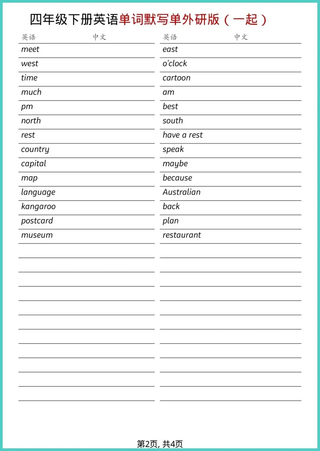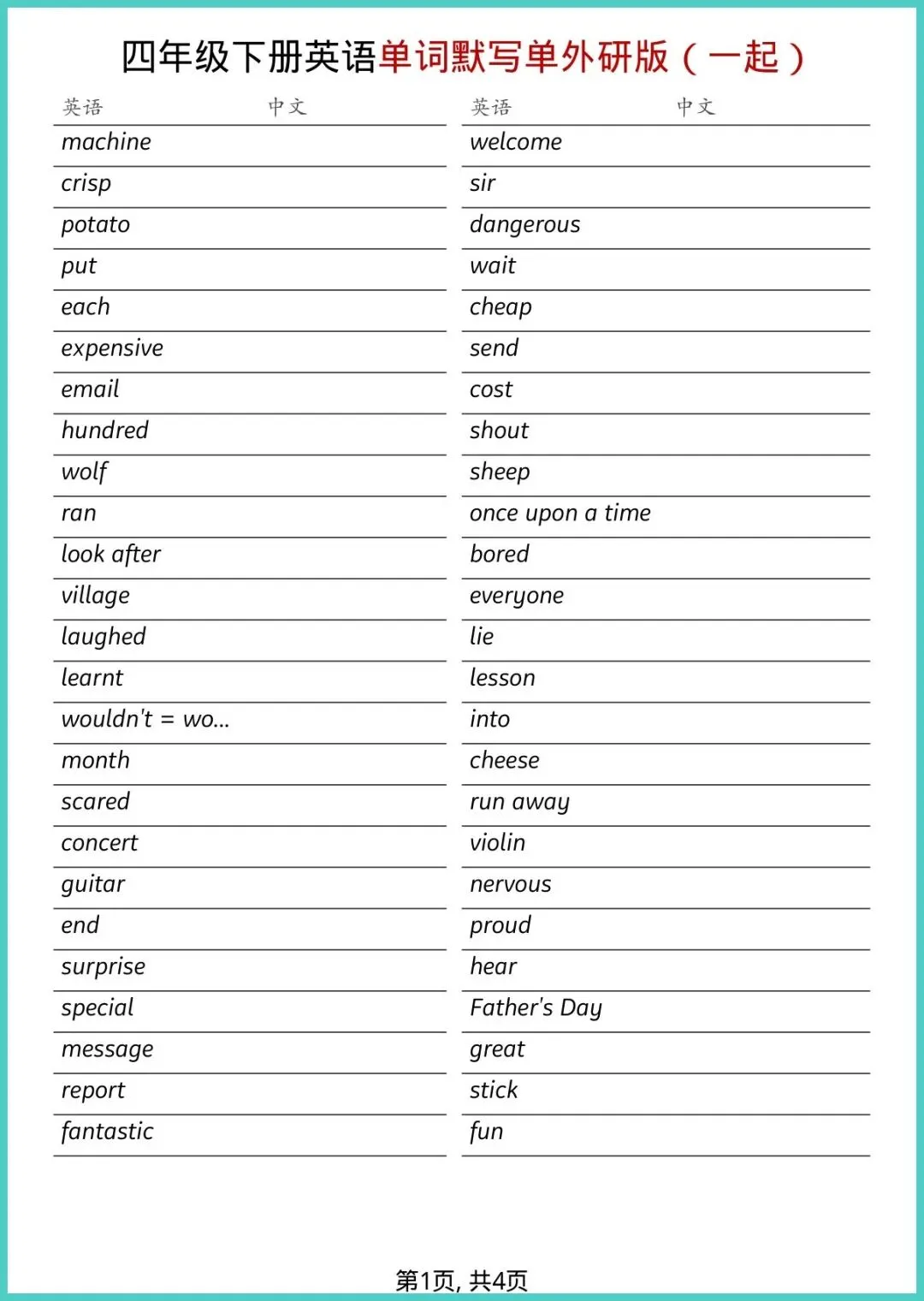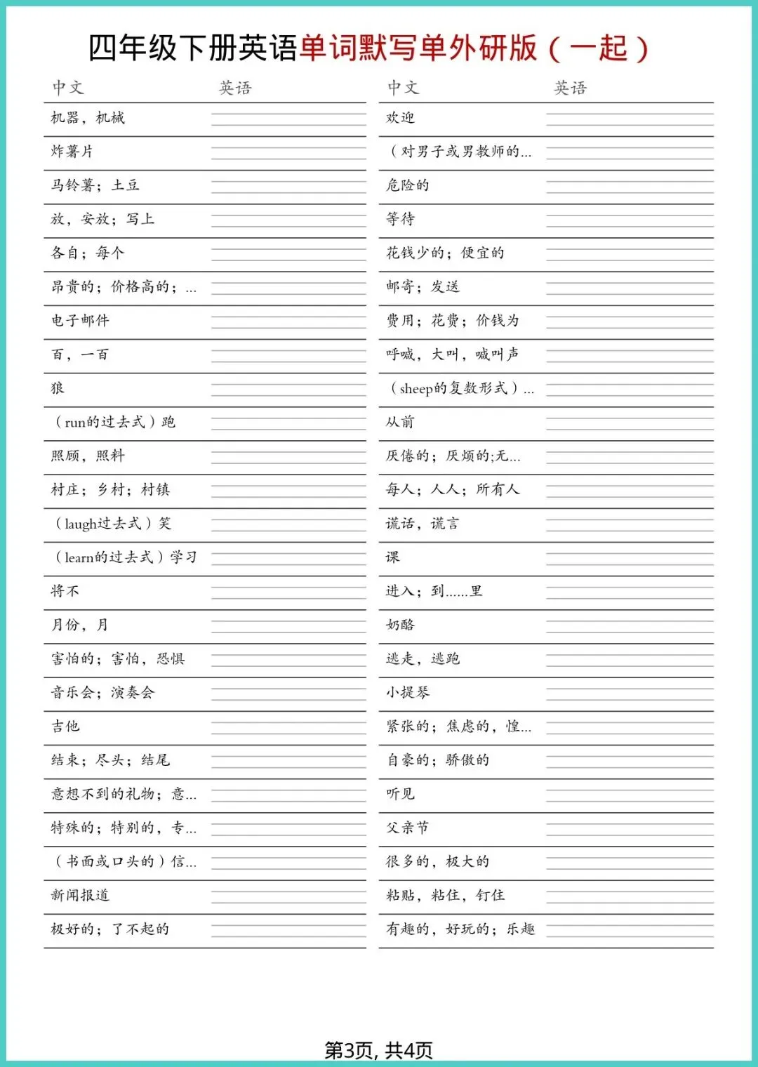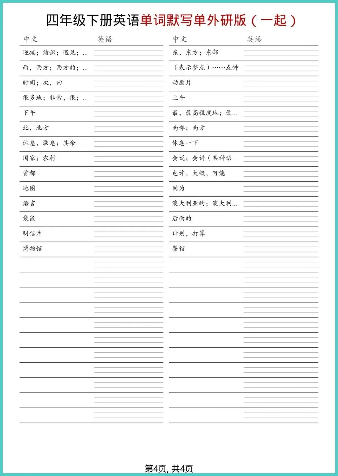 【免费下载】四年级(下)英语_全册单词默写单《外研版(一起)》 | PDF完整高清电子版可打印