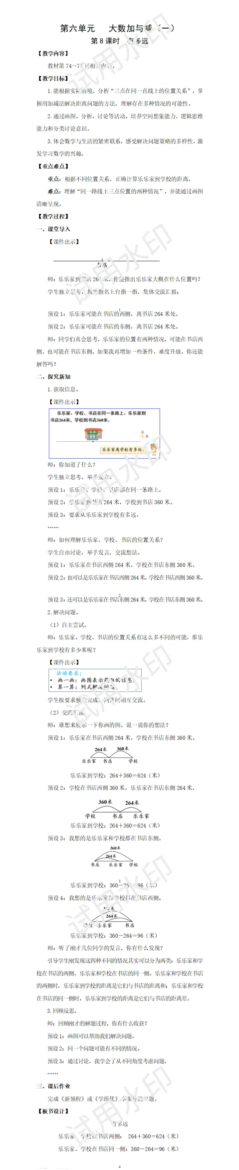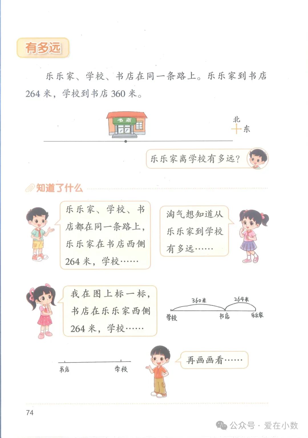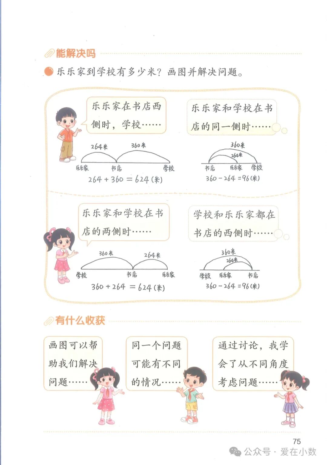 本节课通过引导学生画图分析乐乐家、学校、书店的位置关系,将抽象的“位置可能性”转化为具象的图形,有效帮助学生理解“同一侧”和“两侧”两种情况,让难点(分类讨论的必要性)在画图过程中自然被感知,学生对两种距离计算方法的掌握较为扎实。但部分基础薄弱的学生在“画图规范度”和“情况完整性”上存在不足,如画图时未明确标注距离、容易遗漏其中一种位置情况。这反映出在课前对学生空间想象能力和分类意识的预设不够充分,对学困生的指导需更具针对性。