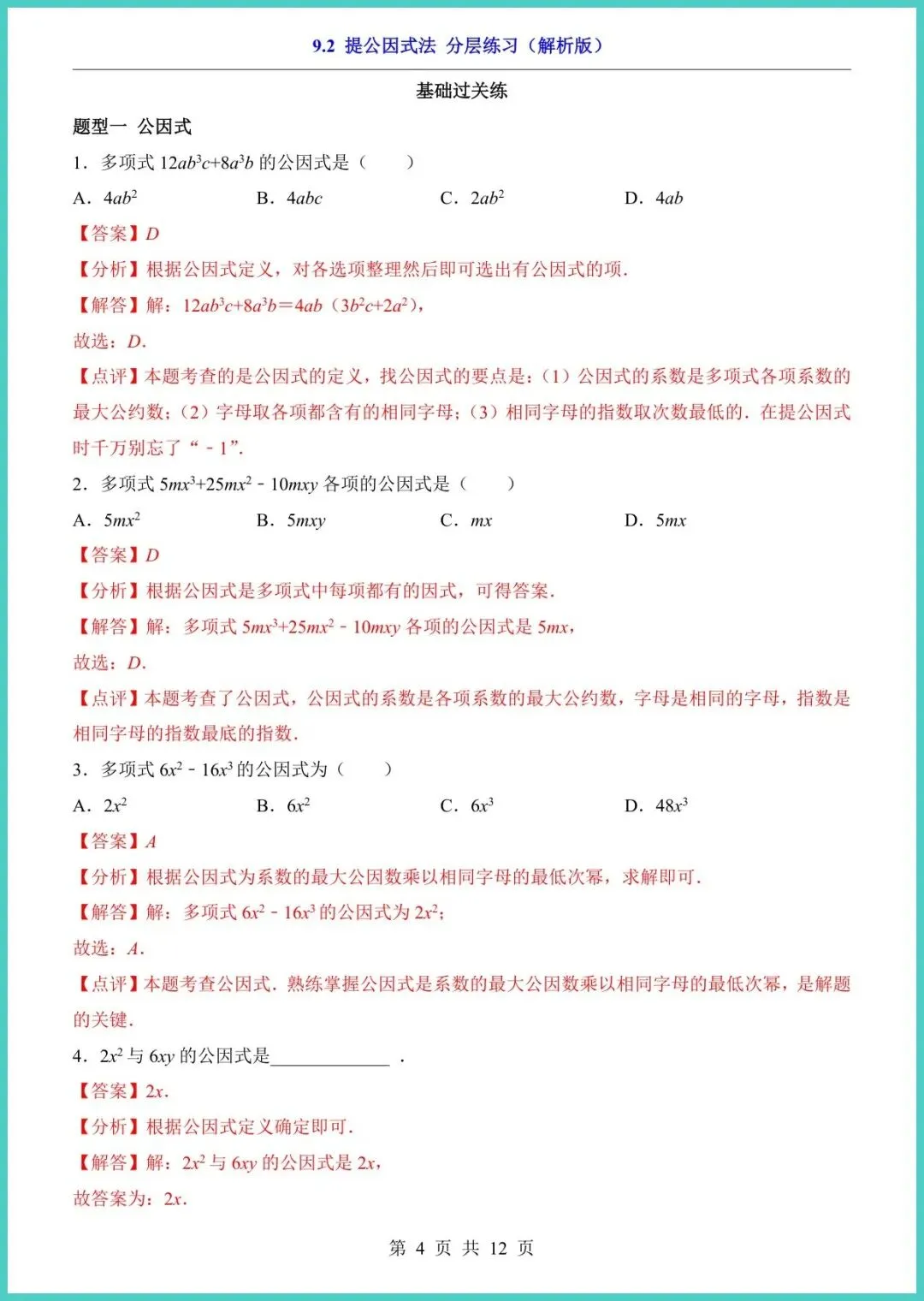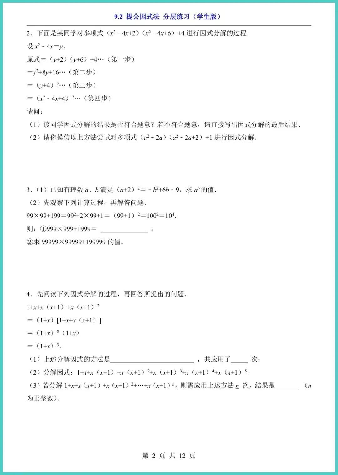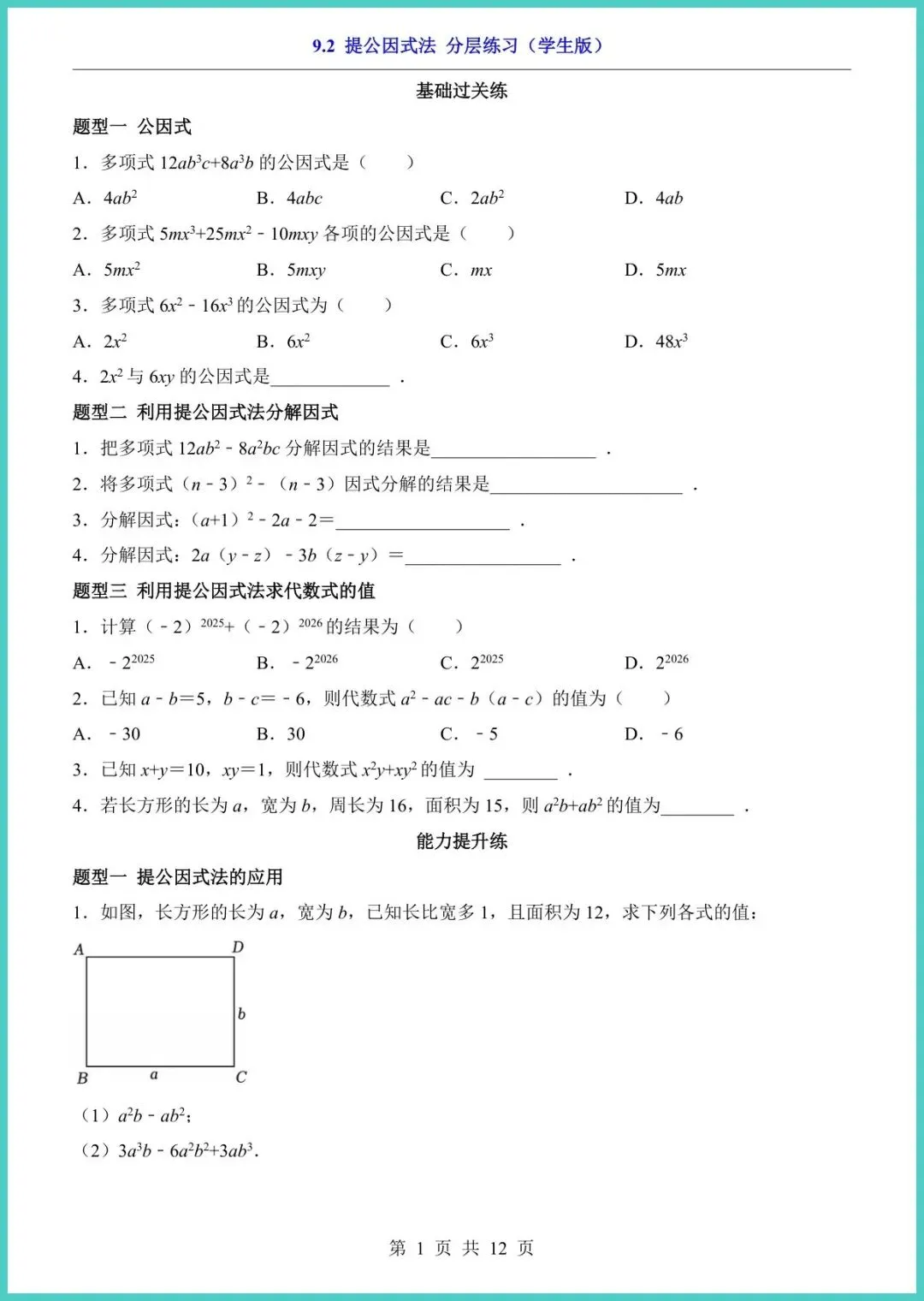 2025年春季苏科版八年级下册数学《9.2提公因式法·分层练习》新鲜出炉,12页精编,专为“因式分解”痛点定制!A4排版,可打印可下载。资料按“基础—进阶—拓展”三级分层:基础口算帮孩子秒找公因式,进阶题型融入中考变式,拓展挑战压轴题,附满分答题模板与易错警示,一趟练完,计算速度提升50%,月考提分看得见!想让孩子告别“提公因式”丢分?家长现在就打印,今晚就能开练!