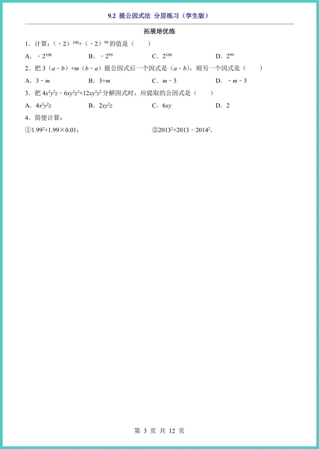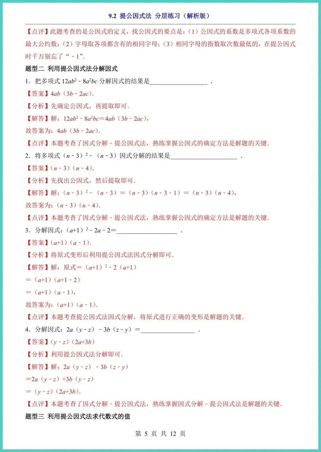 【免费下载】八年级(下)数学9_2_提公因式法_分层练习(苏科版) | PDF完整高清电子版可打印