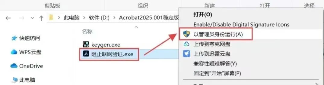 2.选中【阻止联网验证】鼠标右键选择【以管理员身份运行】。(如果打开此文件夹是空的,一般是文件被杀毒软件或者系统防护、实时保护等拦截删除了,退出防护重新解压即可)