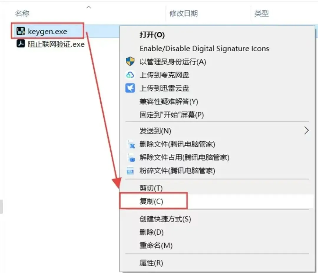 5.选中【keygen】程序,鼠标右键选择【复制】。(或者选中直接Ctrl+C键复制)