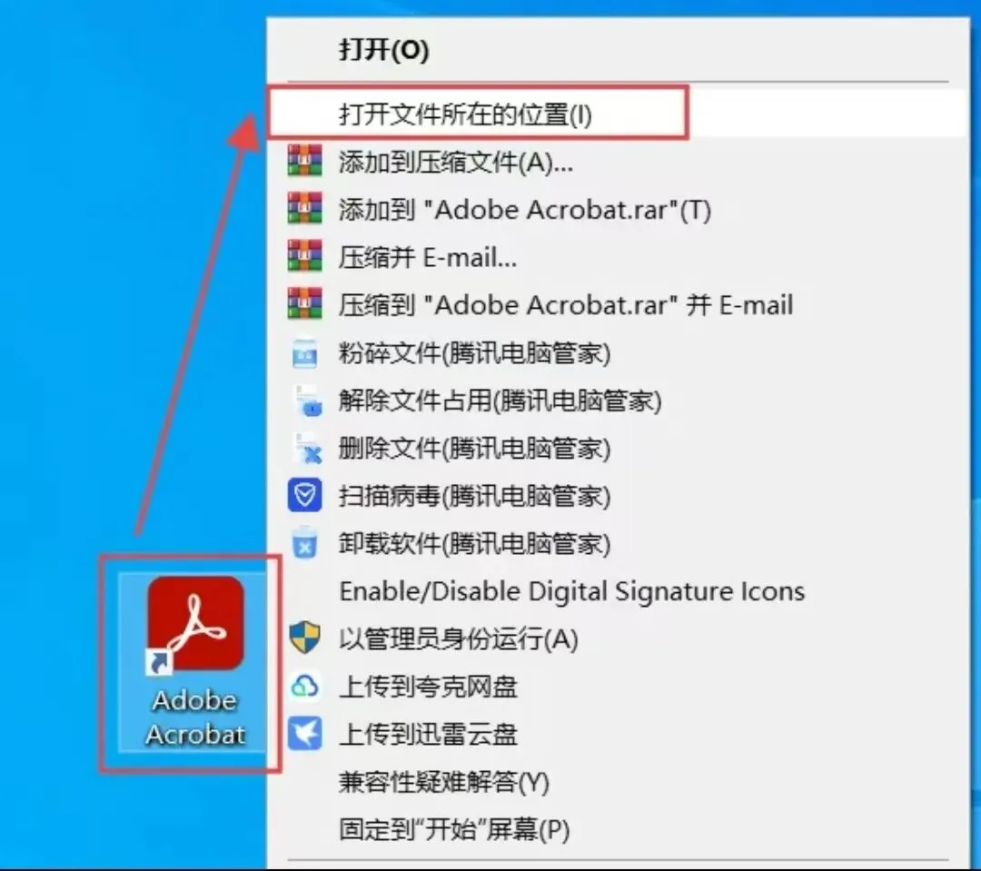 6.回到电脑桌面,选中刚安装的Adobe Acrobat快捷方式,鼠标右键选择【打开文件所在的位置】。