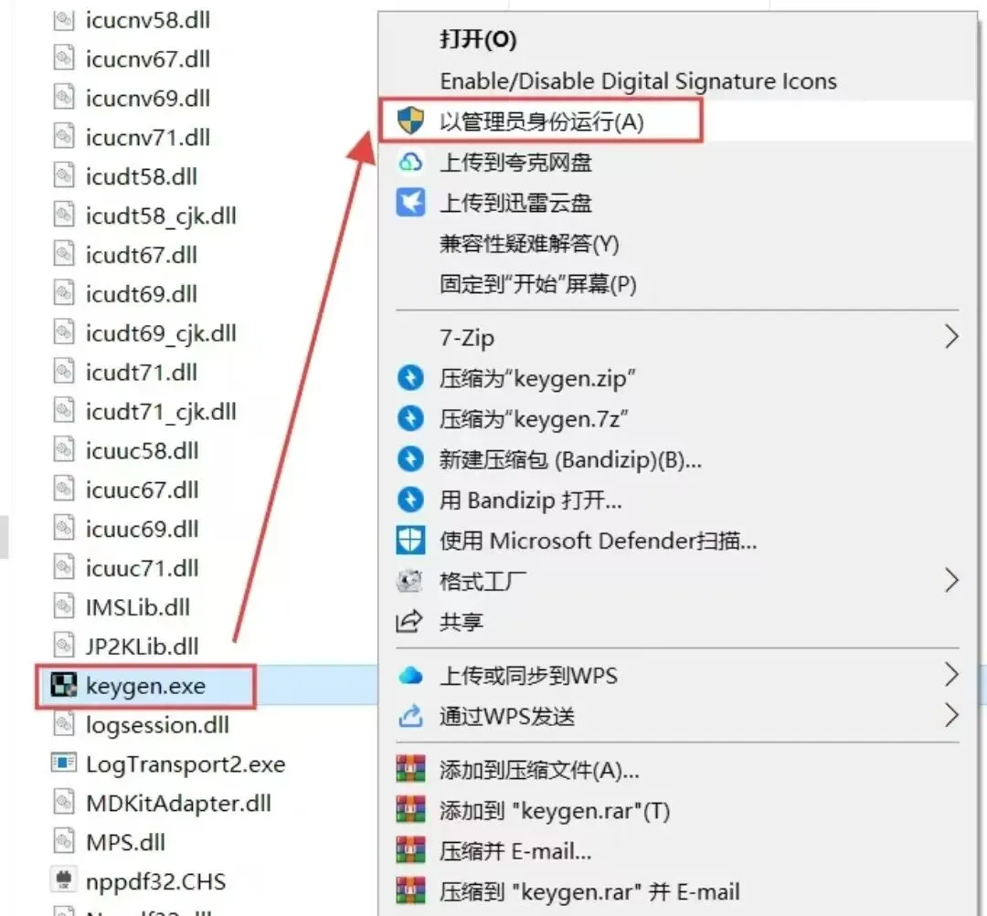 9..选中粘贴过来的【keygen】程序,鼠标右键选择【以管理员身份运行】。