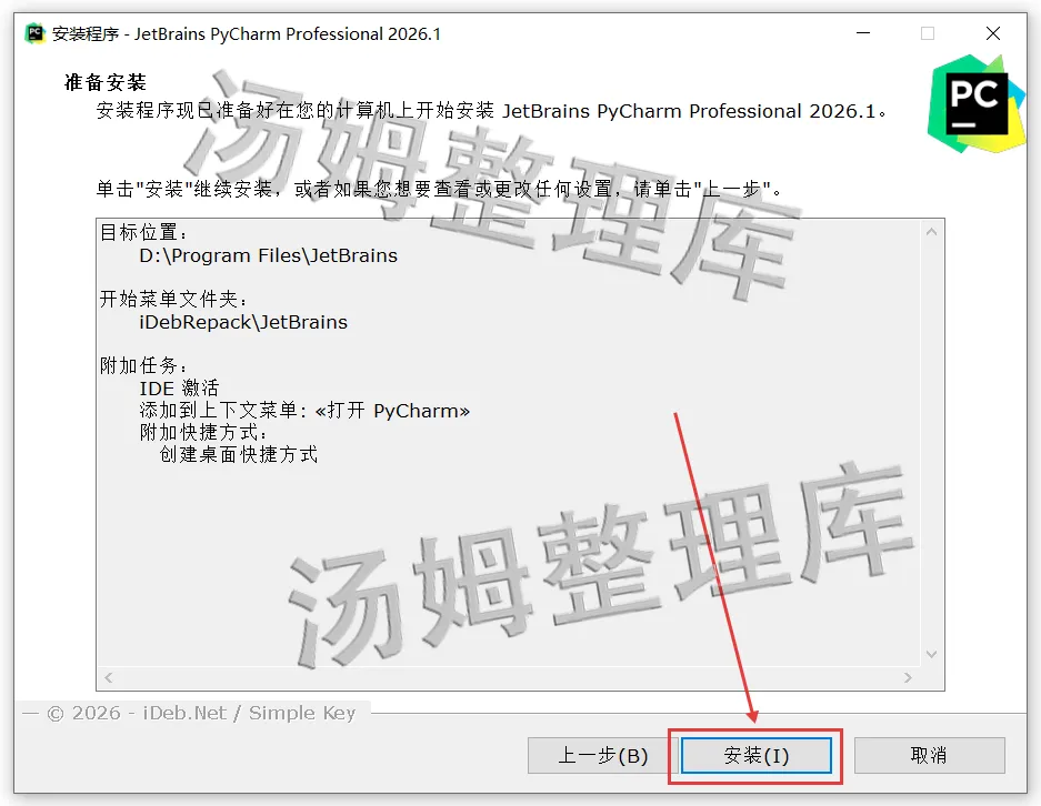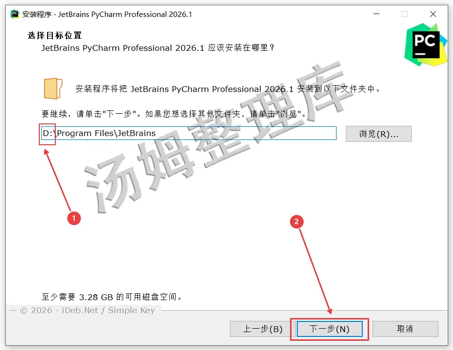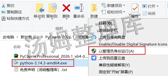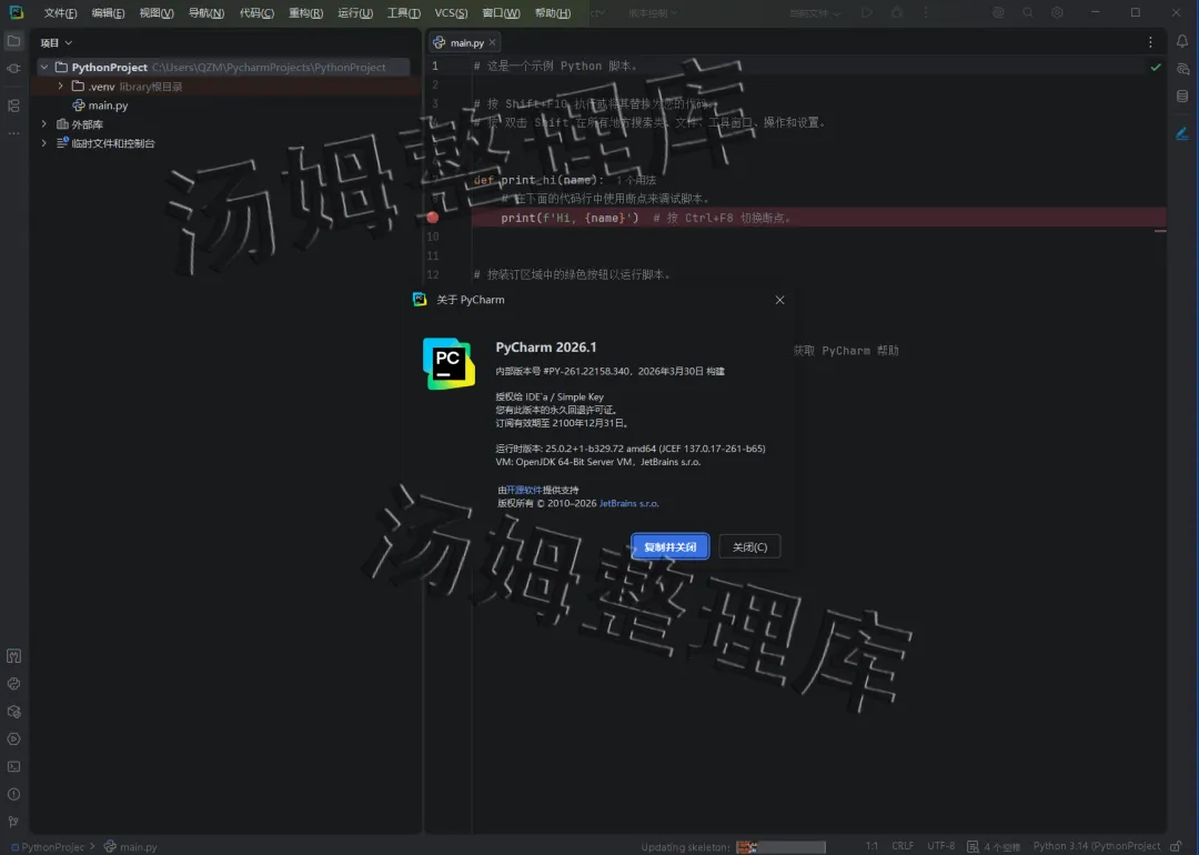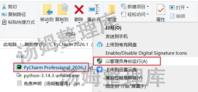 [温馨提示]:我们提供用户下载的所有内容均来自互联网。仅限技术交流,不得用作商业。(解压安装文件前,先退出所有杀毒软件(包括 Windows 系统自带的 Defender和第三方软件等),这样激活文件不会被误删)1.下载好解压PyCharm 2026软件安装包并打开。2.选择【python-3.14.3-amd64】右键点击【以管理员身份运行】。(如果有安装过此程序的同学可以跳到步骤8开始)3.勾选上【Use admin...】和【Add python】再点击【Customize...】。5.先勾选【Install Python...】然后修改安装路径,可以像我这样把地址栏首字母C改成D就安装到D盘了,也可以自行选择,修改好点击【Install】。8.返回PyCharm 2026安装文件夹,选中【PyCharm Professional 2026】程序,右键点击【以管理员身份运行】运行安装。9.打开PyCharm 2026安装界面后,点击【下一步】。10.更改PyCharm 2026程序安装路径:可以把地址栏首字母C改成D就安装到D盘了,也可以自行选择,修改好最后点击【下一步】。15.显示PyCharm 2026.1安装好后,先取消勾选【下载插件密钥】再点击【完成】。16.双击桌面【PyCharm Professional图标】打开程序。17.由此弹窗点击【Skip】。(电脑安装过PyCharm 的同学打开可能没有17~20的弹窗,直接就进入程序主界面,如果进入是英文版,看文章后面切换中文版教程)21.到这里PyCharm 2026就安装完成了,已经可以永久使用!1.点击上方菜单栏【File】展开再点击【Settings...】。3.把English选择修改为【Chinese(简体中文)】按提示重启软件就是中文版本了。1.安装提供的所有下载文件均是网络收集,请于下载后的24小时内删除。如需体验更多乐趣,请支持正版。2.我们提供用户下载的所有内容均来自互联网。如有内容侵犯您的版权或其他利益的,请联系我们会在收到消息后24小时内处理。