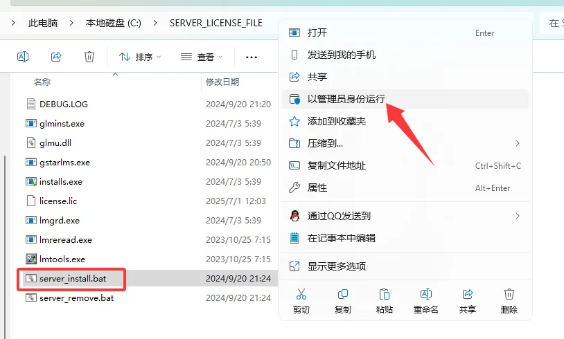 9、粘贴到电脑C盘根目录下,然后打开文件夹右键以管理员身份运行server_install.bat。