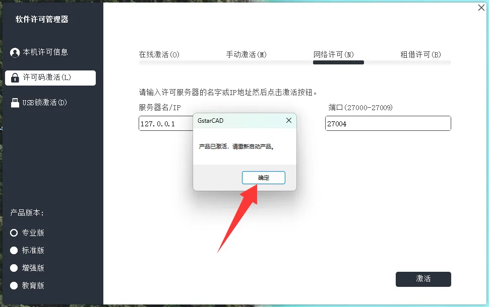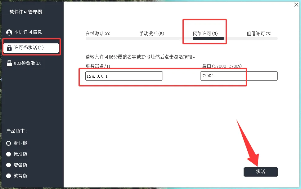 16、选择许可码激活,然后选择网络许可。输入127.0.0.1,端口:27004,然后点击激活。