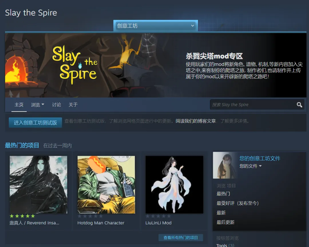 通常情况下,steam平台的游戏大多是可以直接通过平台内置的“创意工坊”来直接对MOD进行下载和安装的,例如《杀戮尖塔》初代。