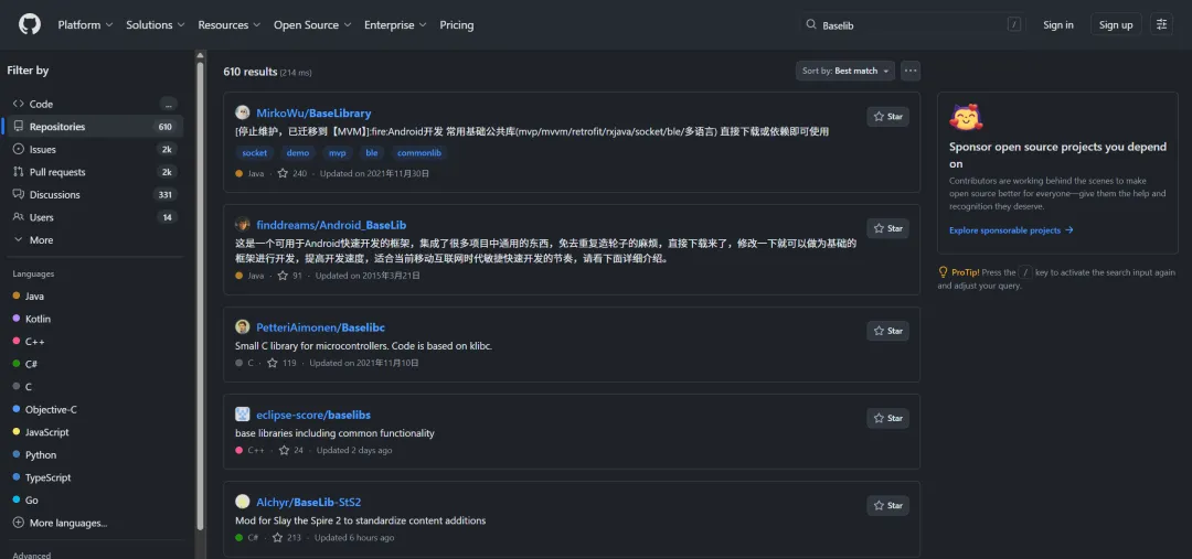 使用github下载则相对来说没有这么直观,首先进入github页面,在搜索框中输入baselib。