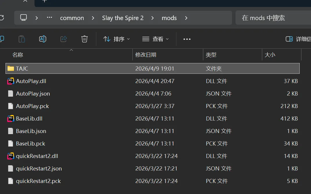 .pck是MOD的素材包,里面打包了各种卡牌图片和角色建模等信息,如果你下载的是一个美化型MOD,那么这个文件通常会比较大。