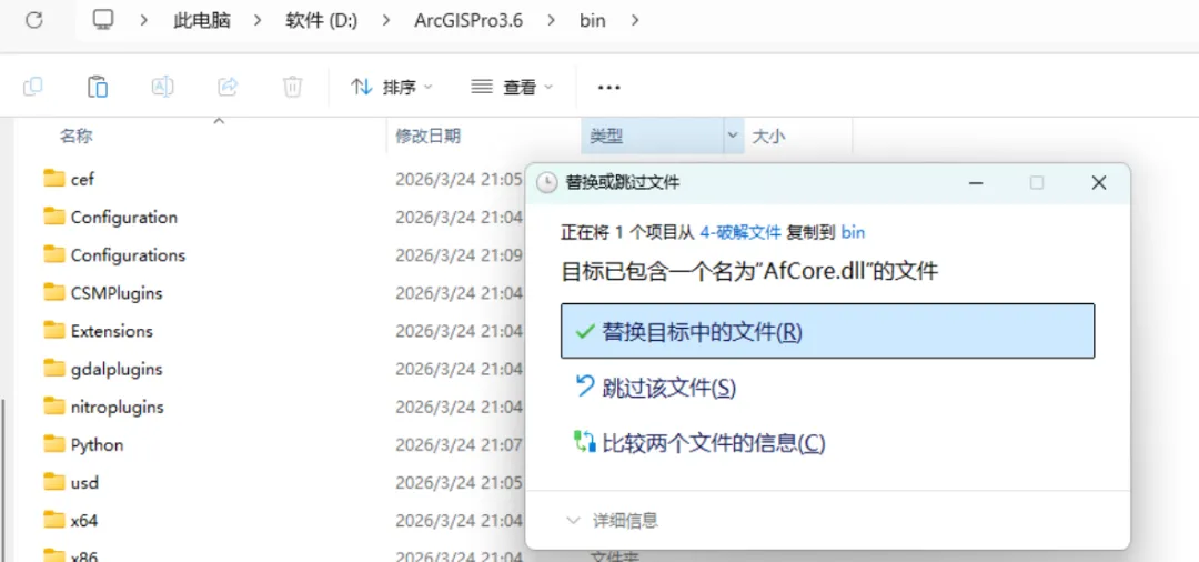 复制破解文件文件夹下的"AfCore.dll,粘贴到安装目录的bin文件夹下,选择替换目标中的文件。