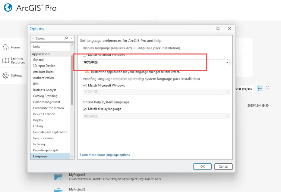 安装完成,在开始菜单中找到ArcPro3.6,将其拖到桌面,双击打开。点击Settings,点击“options”,将语言改为中文,点击"OK",关闭软件。
