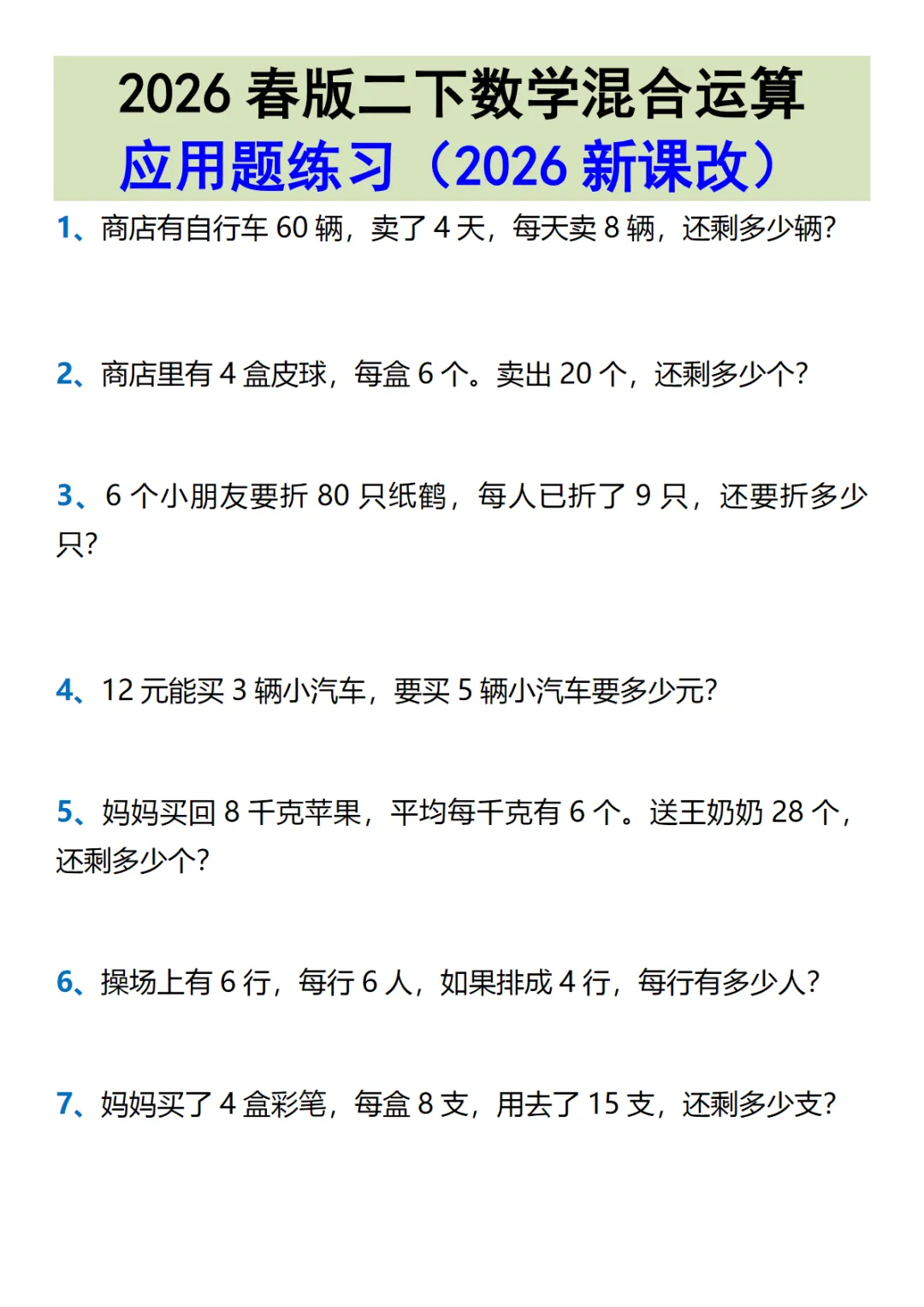 【免费下载】2026春新版二年级(下)数学 混合运算应用题练习,PDF电子版,共8页,先保存,以免资源失效