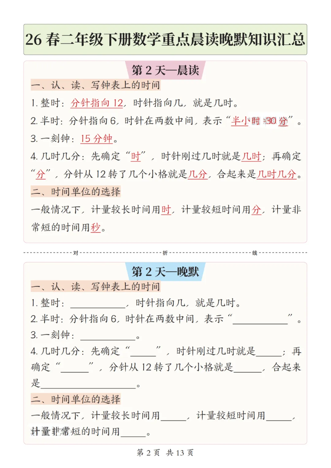 【免费下载】二年级(下)数学 26春重点晨读晚默知识汇总,PDF电子版,共13页,先保存,以免资源失效