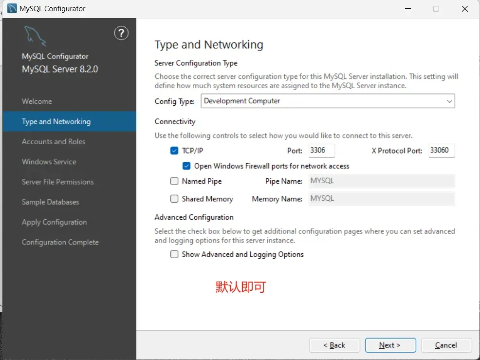 2、这一步是选择服务器配置类型和网络,端口,三种类型(开发计算机,服务器计算机和mysql专用)mysql占用的内存不一样,要是自己个人学习使用建议选择development computer