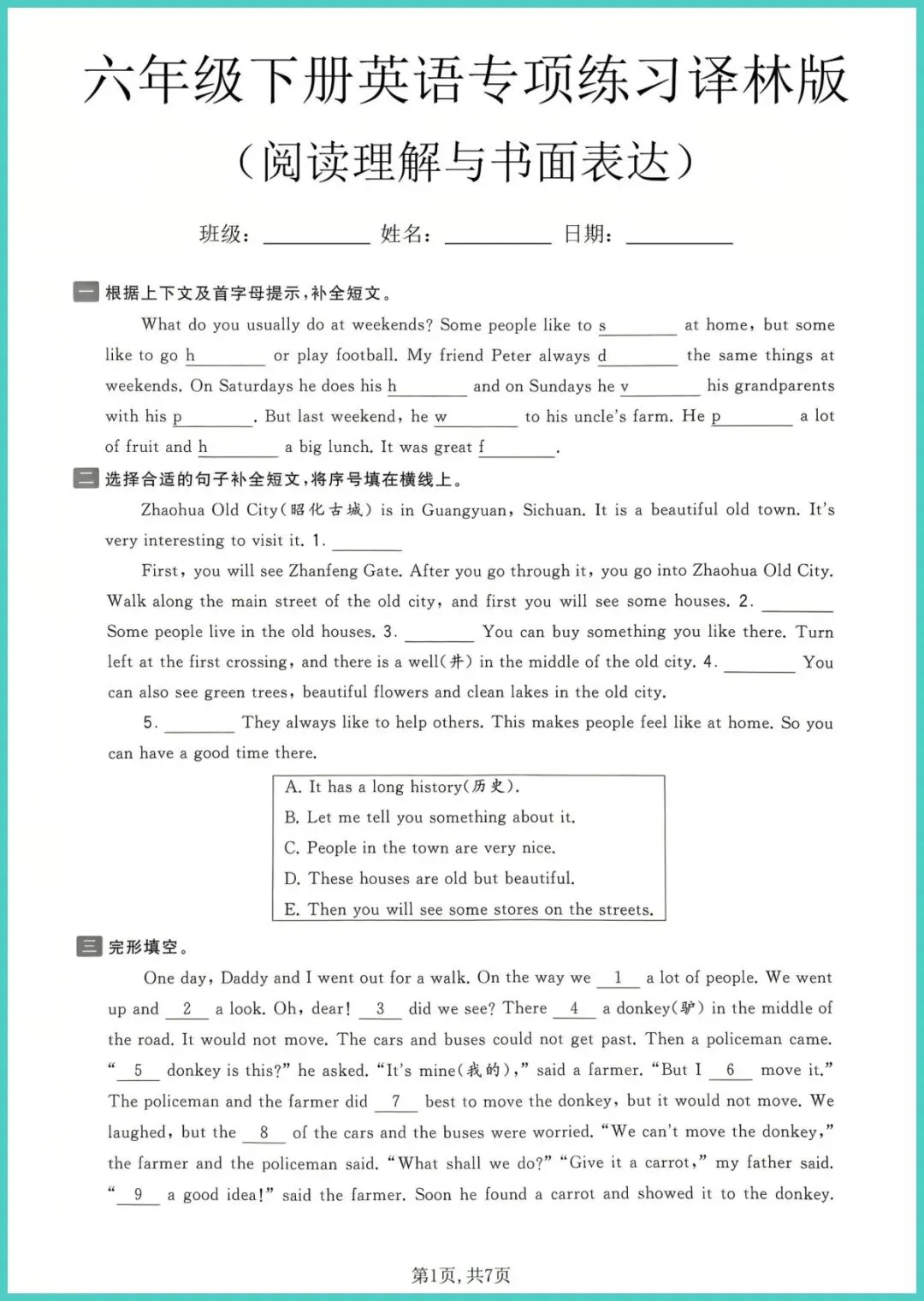 24春译林版六年级下册英语《阅读理解与书面表达专项练习》新鲜出炉,7页浓缩精华,专为小升初冲刺设计!精选课内外阅读高频写作话题,配思维导图与满分句型,先读再写,层层突破,帮孩子扫清“看不懂、写不出”两大拦路虎,一周练透,语感、词汇、逻辑三箭齐发,期末作文稳拿高分!想让孩子阅读满分、写作出彩的家长,速速打印练起来!