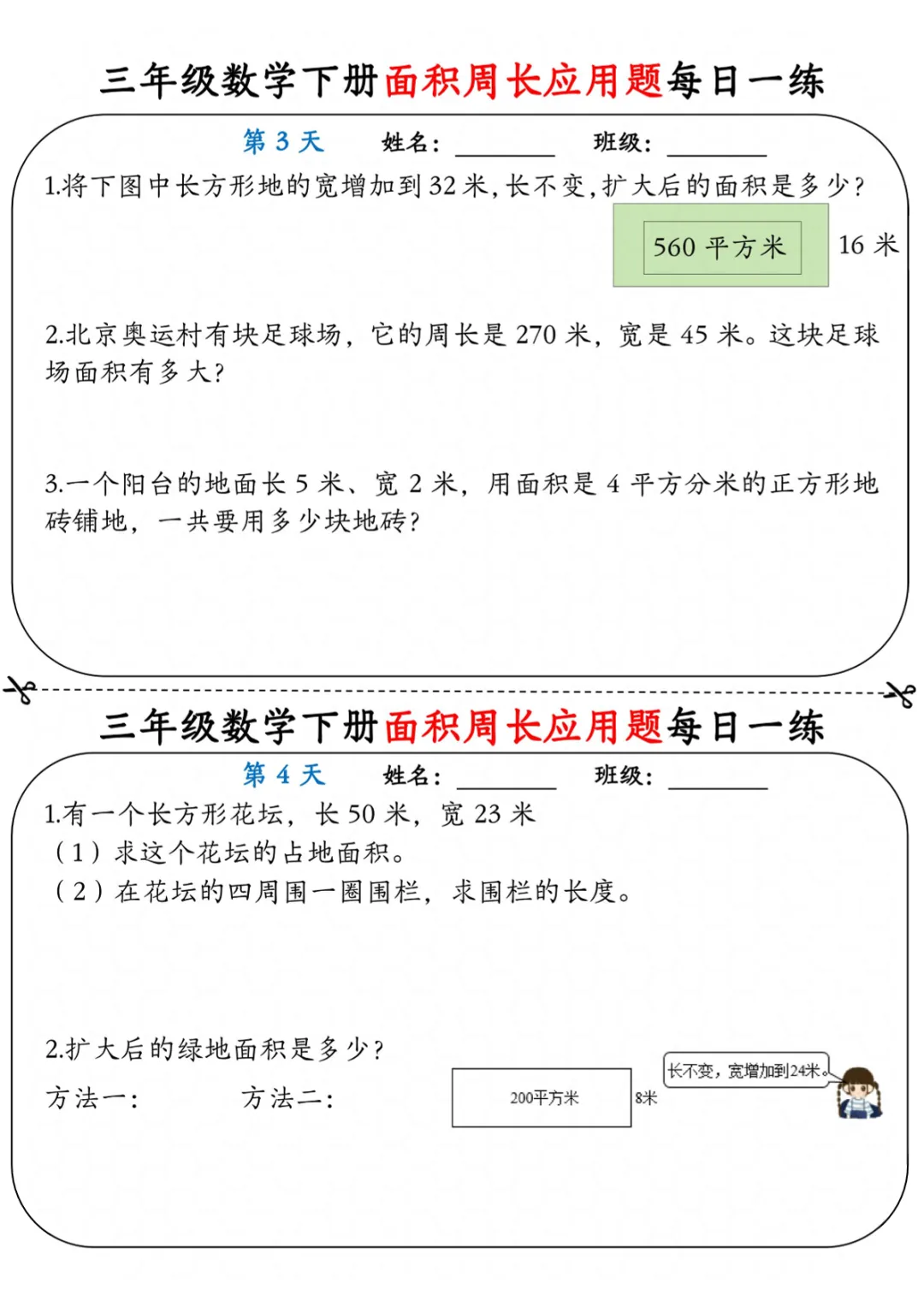 【免费下载】三年级(下)数学《面积周长应用题》每日一练小纸条_1,PDF电子版,共18页,先保存,以免资源失效