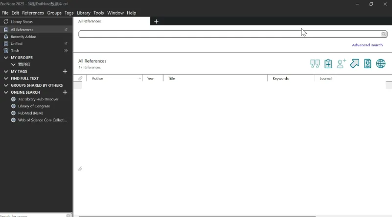 14、打开软件,界面如下,安装成功!(如果是第一次安装EndNote,会提示创建自己的Library,按照指引创建即可)。