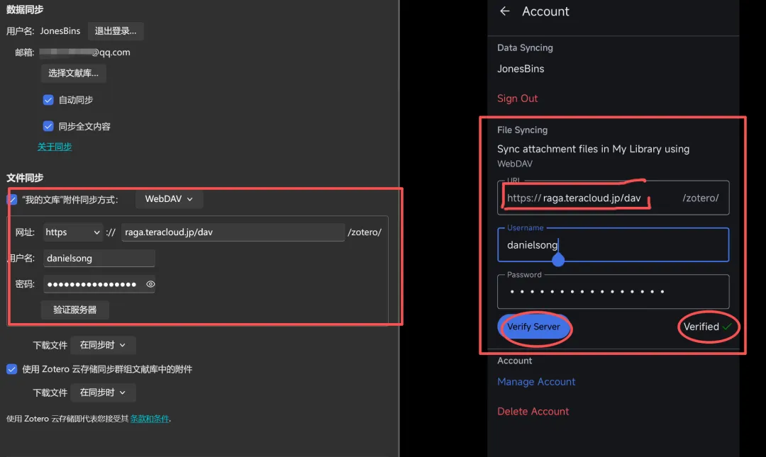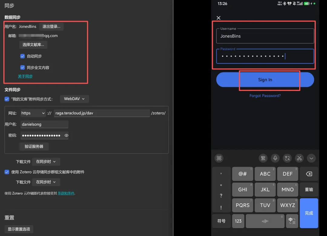 - 想好附件存放方式:如果一直用 Zotero 官方云,手机端不用额外设置;若在桌面端使用 WebDAV(坚果云、INIFCLOUD 等),记好服务器地址与应用密码;(和电脑登录一样的即可)