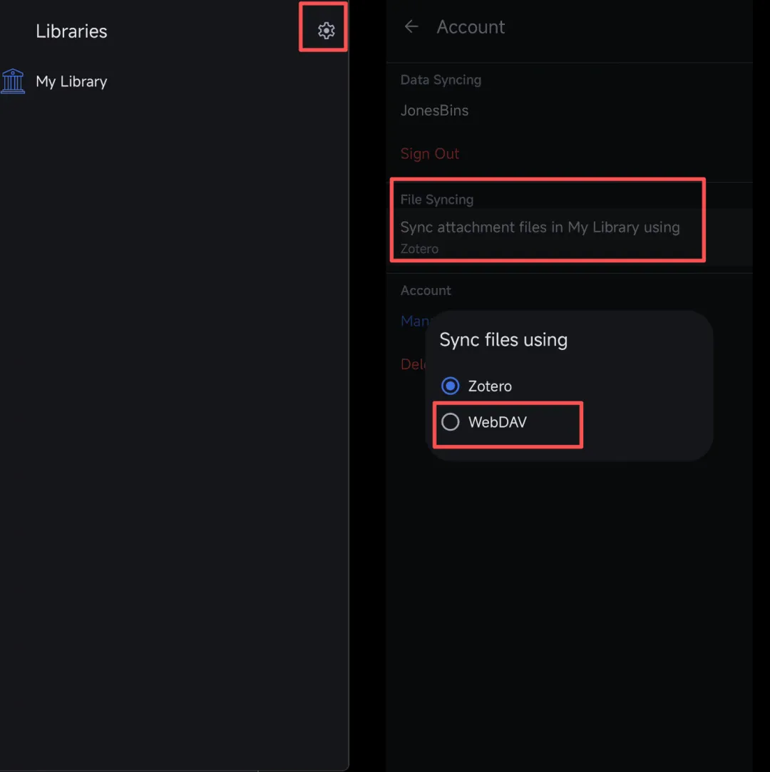 Zotero 安卓端默认只同步条目信息,附件还要你自己挑好仓库。以 WebDAV 为例,流程如下: