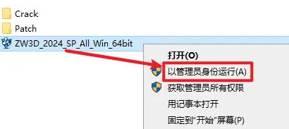 2.打开解压后的文件夹,右键【ZW3D_2024_SP_All_Win_64bit】,选择【以管理员身份运行】。身份运行”