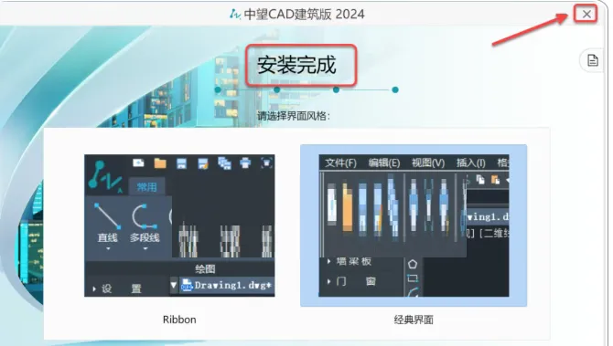 6、界面提示“安装完成”时,点击右上角【X】或【完成】关闭安装向导。